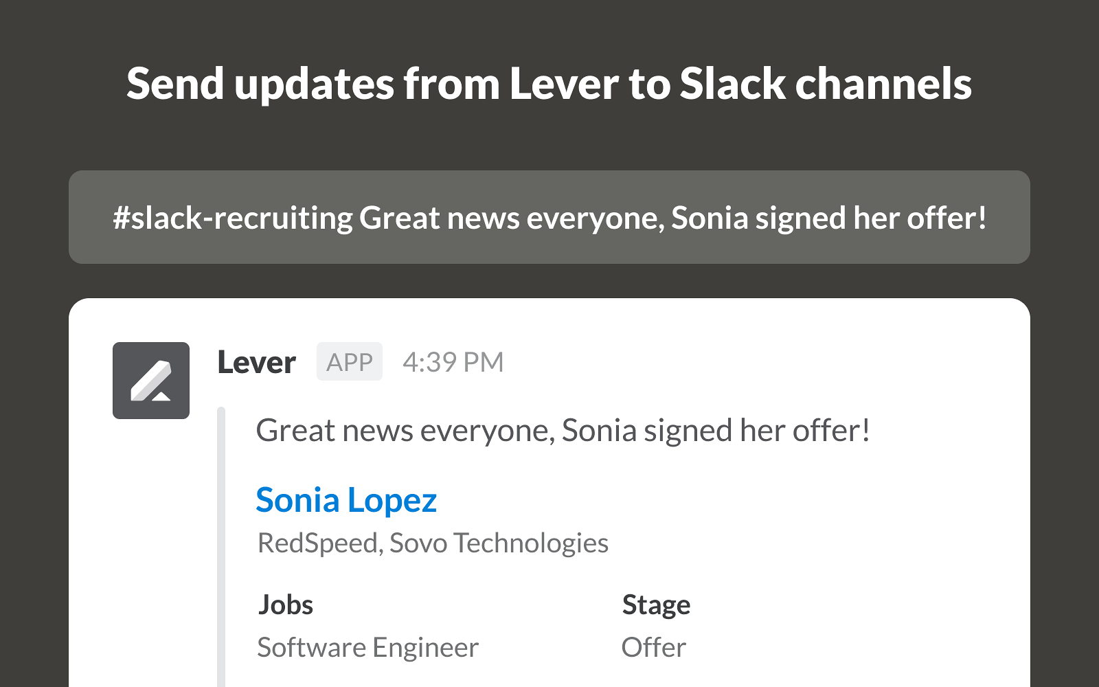 Lever’s Slack integration makes it easy to engage your entire team in the hiring process. From the Lever app, users can post announcements to Slack channels through #mention notes on individual candidate profiles. Using a #mention will automatically push the contents of the note, along with a candidate overview, to the specified Slack channel.