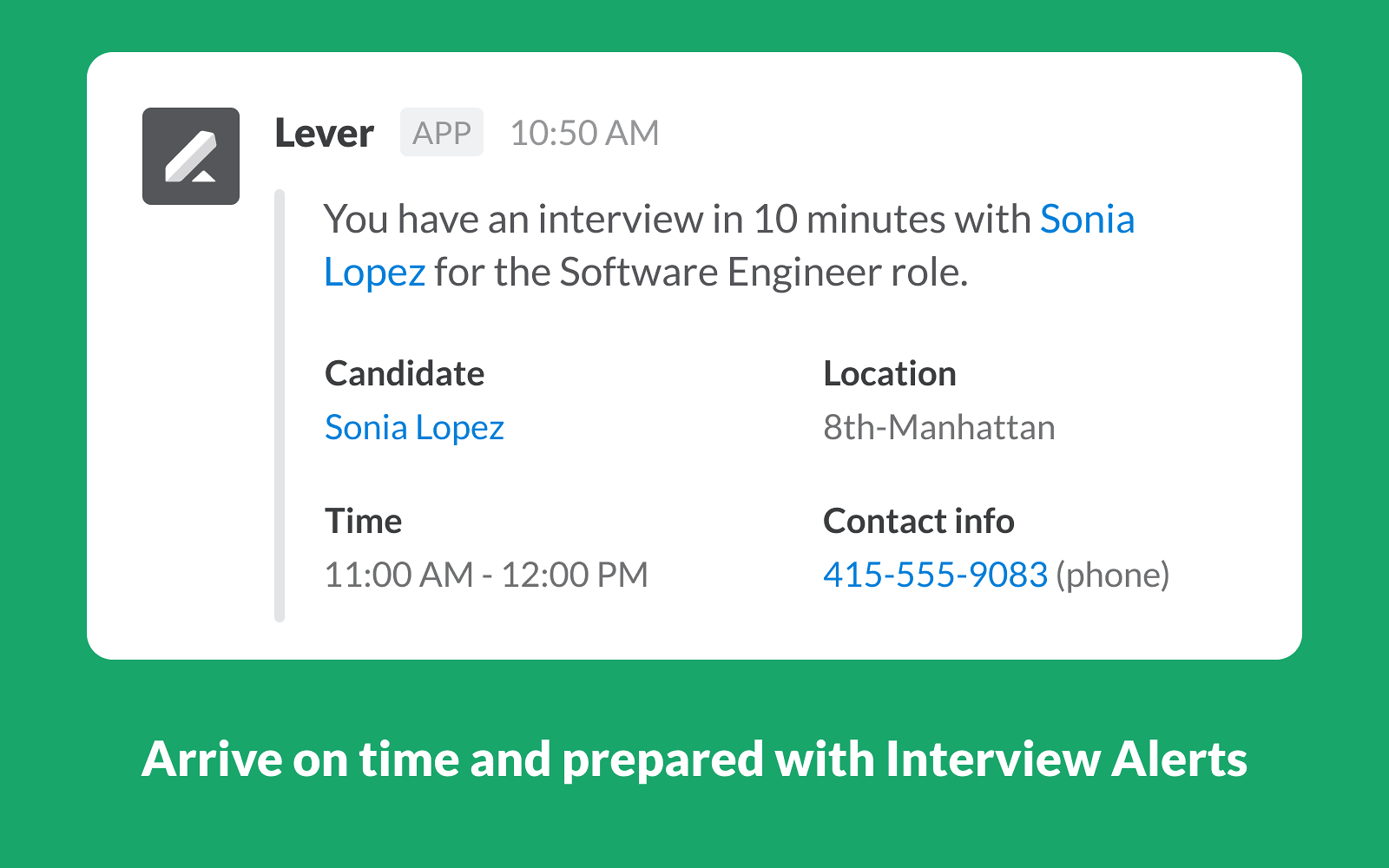 Interviewers who are part of your team can opt in to receiving Interview Alerts via Slack, too. Interview Alerts allow interviewers to receive: