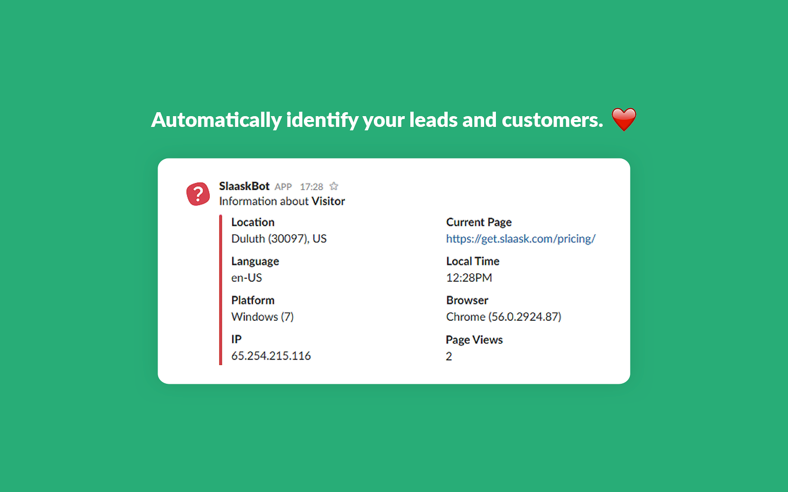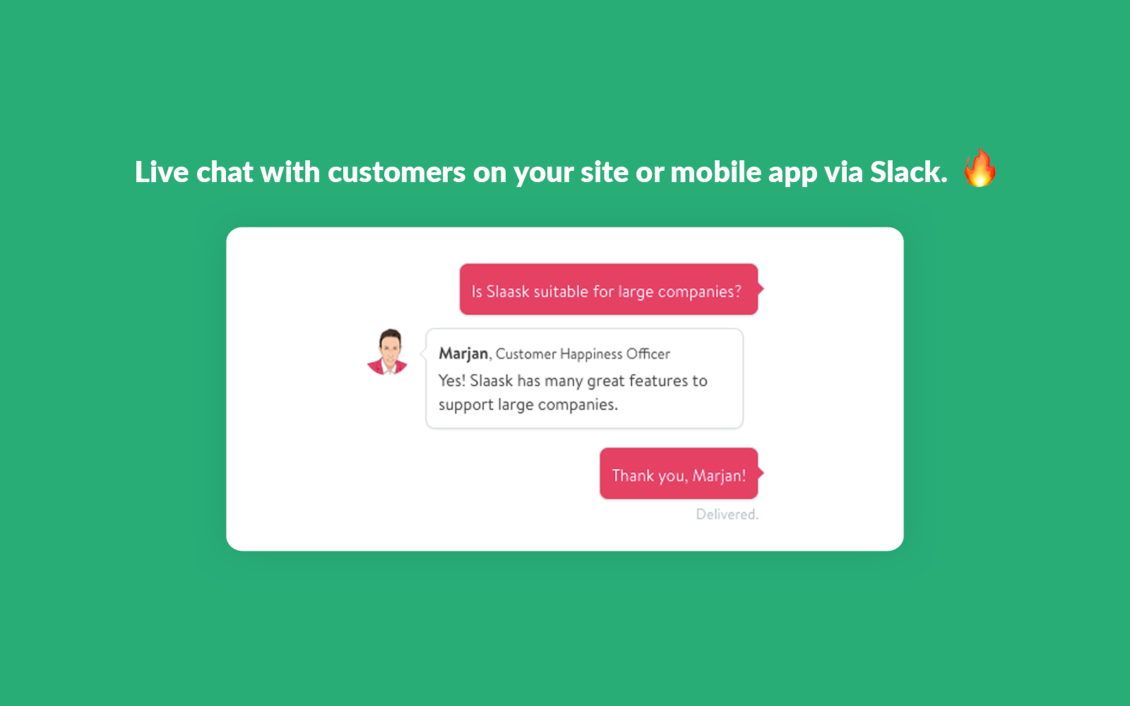 Slaask supercharges your Slack to function as a real-time customer service app shared among your team.Through the Slaask widget on your site or mobile apps, communication from your leads and customers funnels directly through your Slack.Same goes for Facebook and Twitter. Through Slaask, questions and feedback coming through your Facebook and Twitter pages goes directly to your Slack account.Your team can then use Slack, in the same way they always use it, to chat in real time with your leads and customers wherever they are on the web.With Slaask, communicating with your leads and customers from the centralized Slack portal brings you closer to them, enabling levels of user satisfaction like never before.
