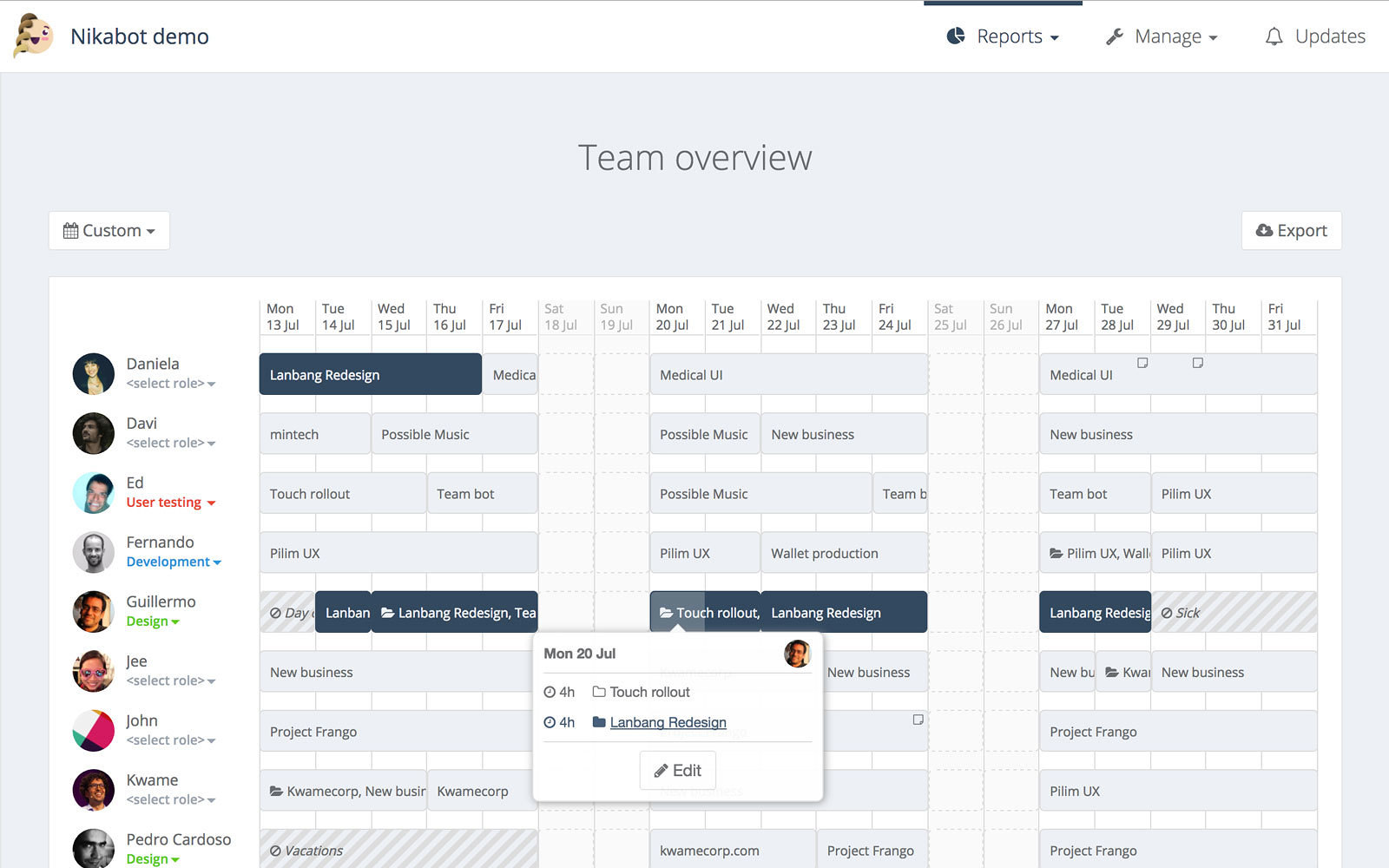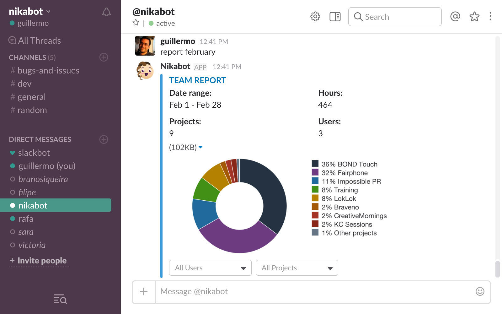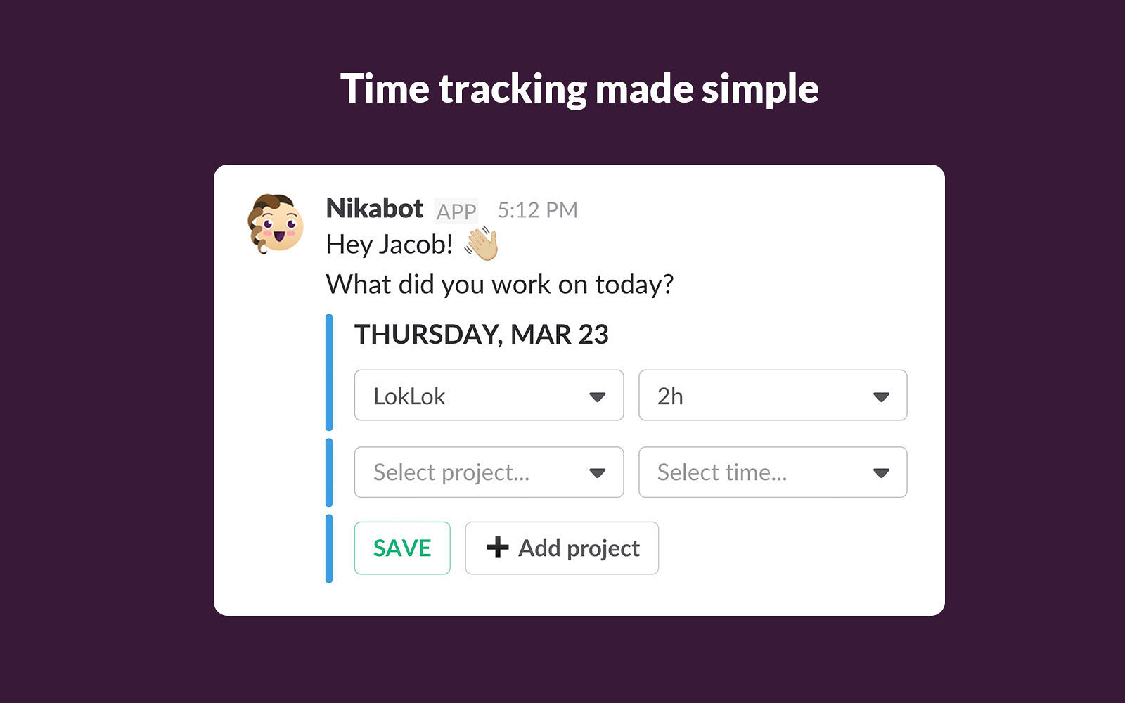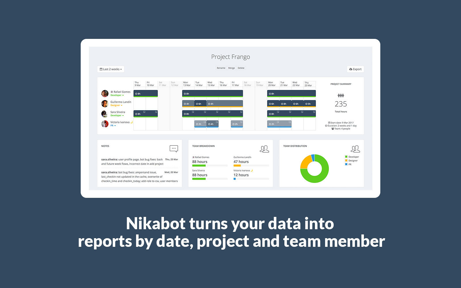 Every day Nikabot asks each member of your Slack team one question: “What project did you work on yesterday?”. She then gathers the information and creates accurate Gantt charts and reports with the data split by time, project and person.