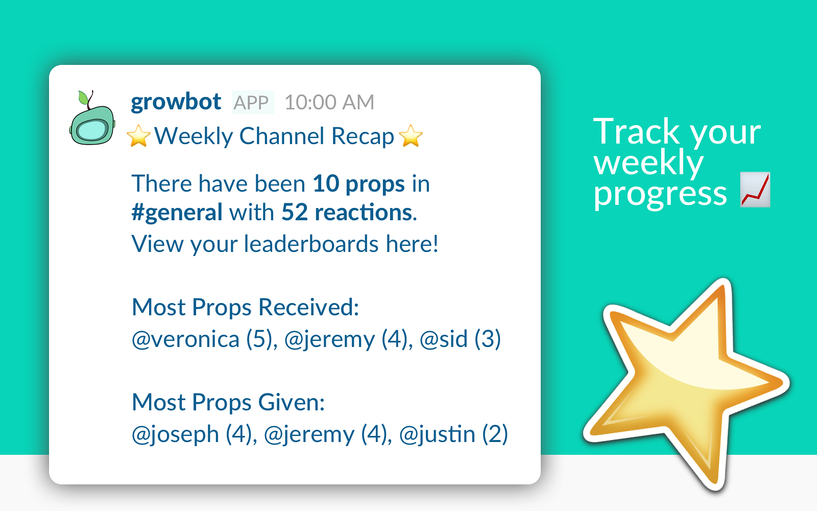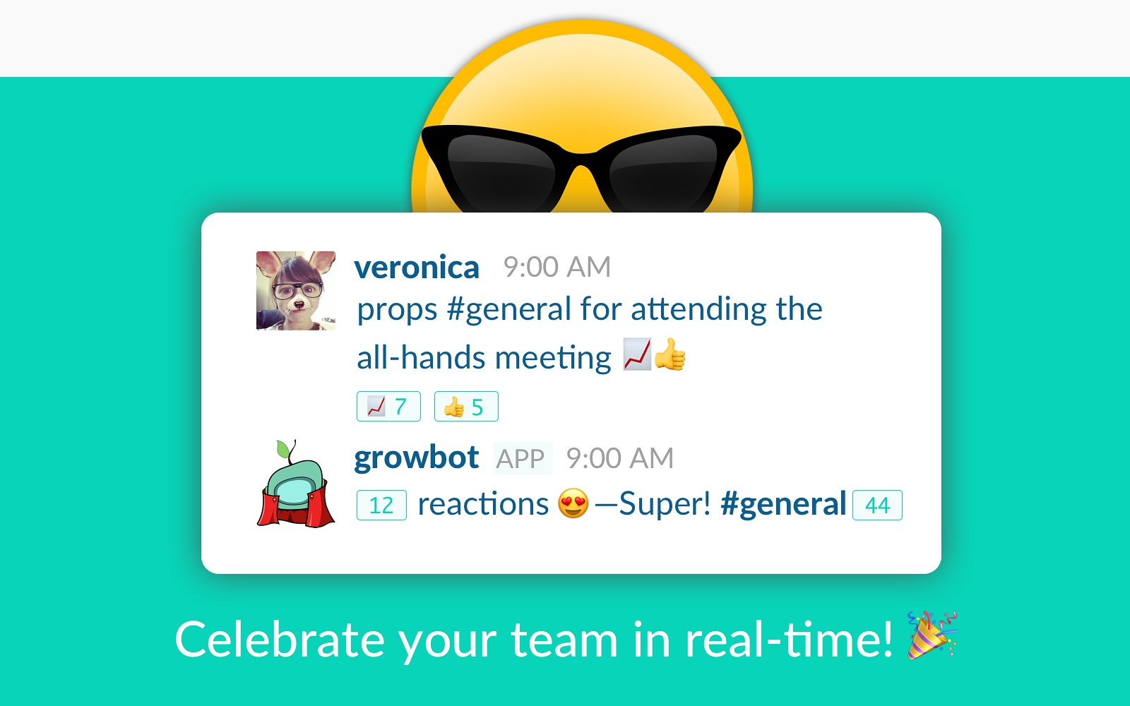 Your team is awesome and Growbot helps you celebrate that together. Invite Growbot to channels or groups for an immediate boost in employee appreciation and recognition. Growbot encourages and listens for team appreciation, automatically adding positive reactions and saving team wins forever. Growbot can also forward wins from all channels to a single channel so #engineering can celebrate with #sales or #design. All wins are viewable in a default channel and in a company web feed.