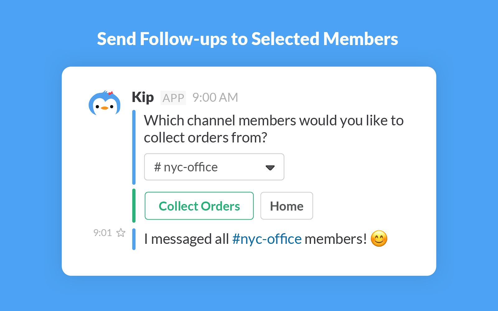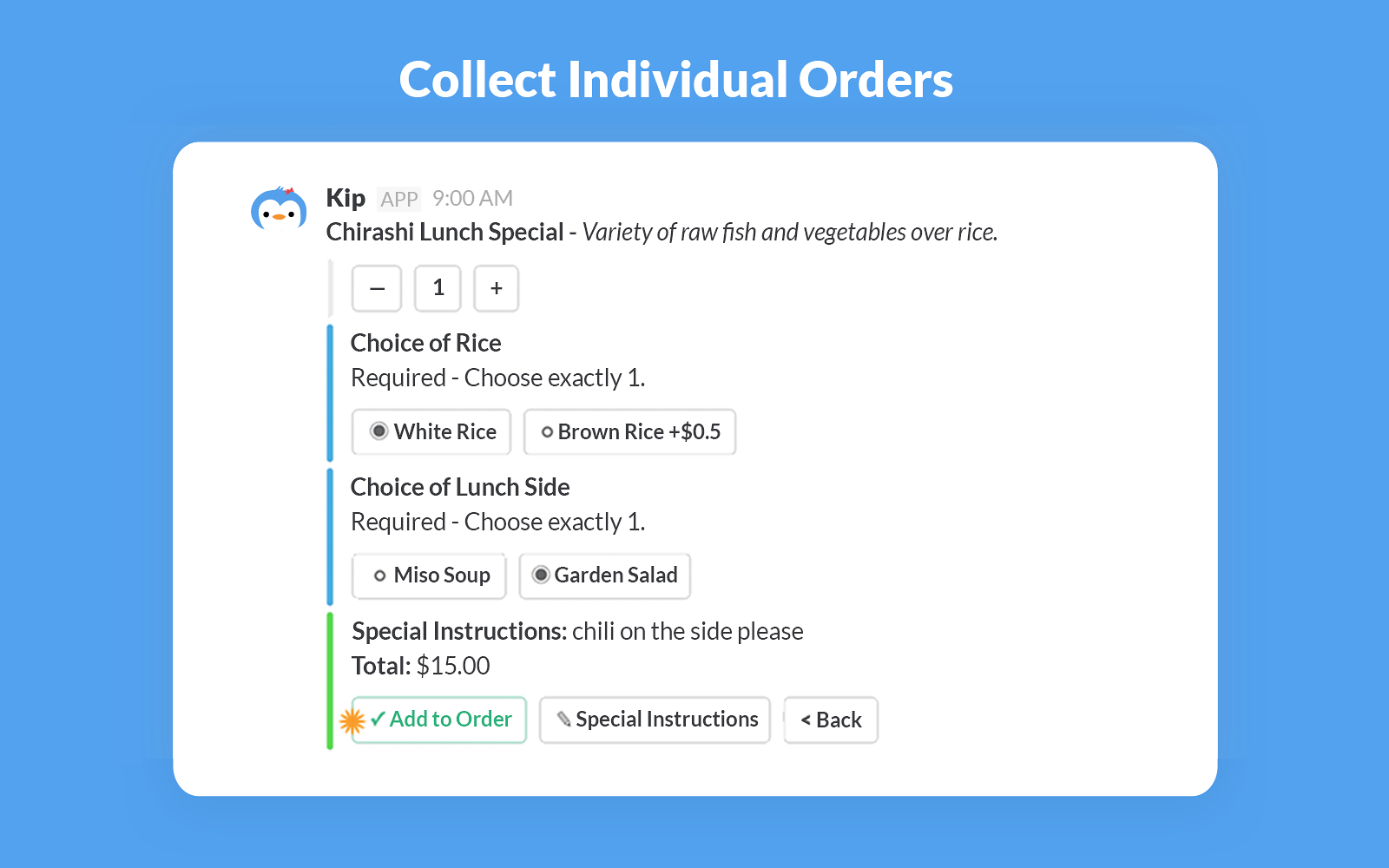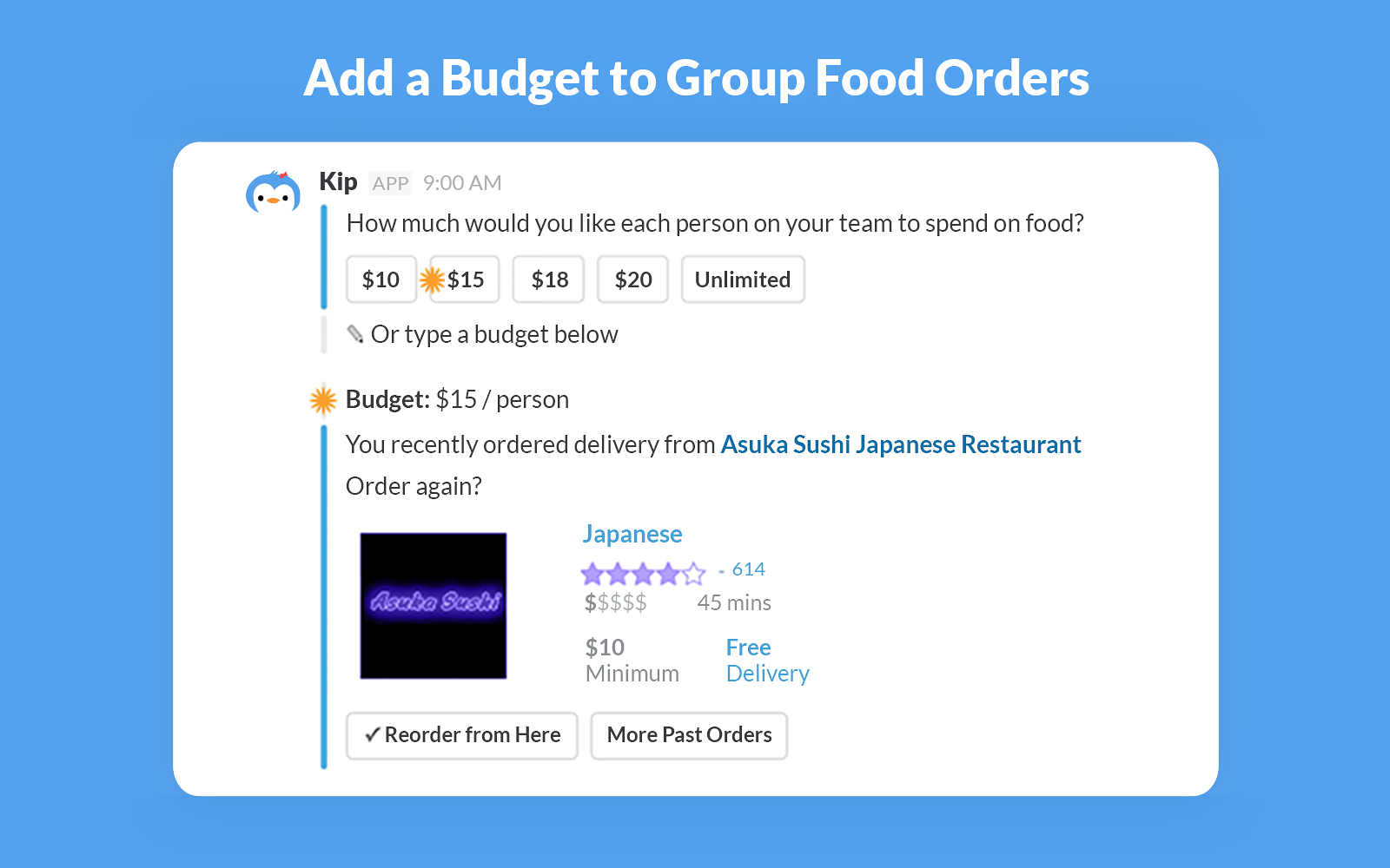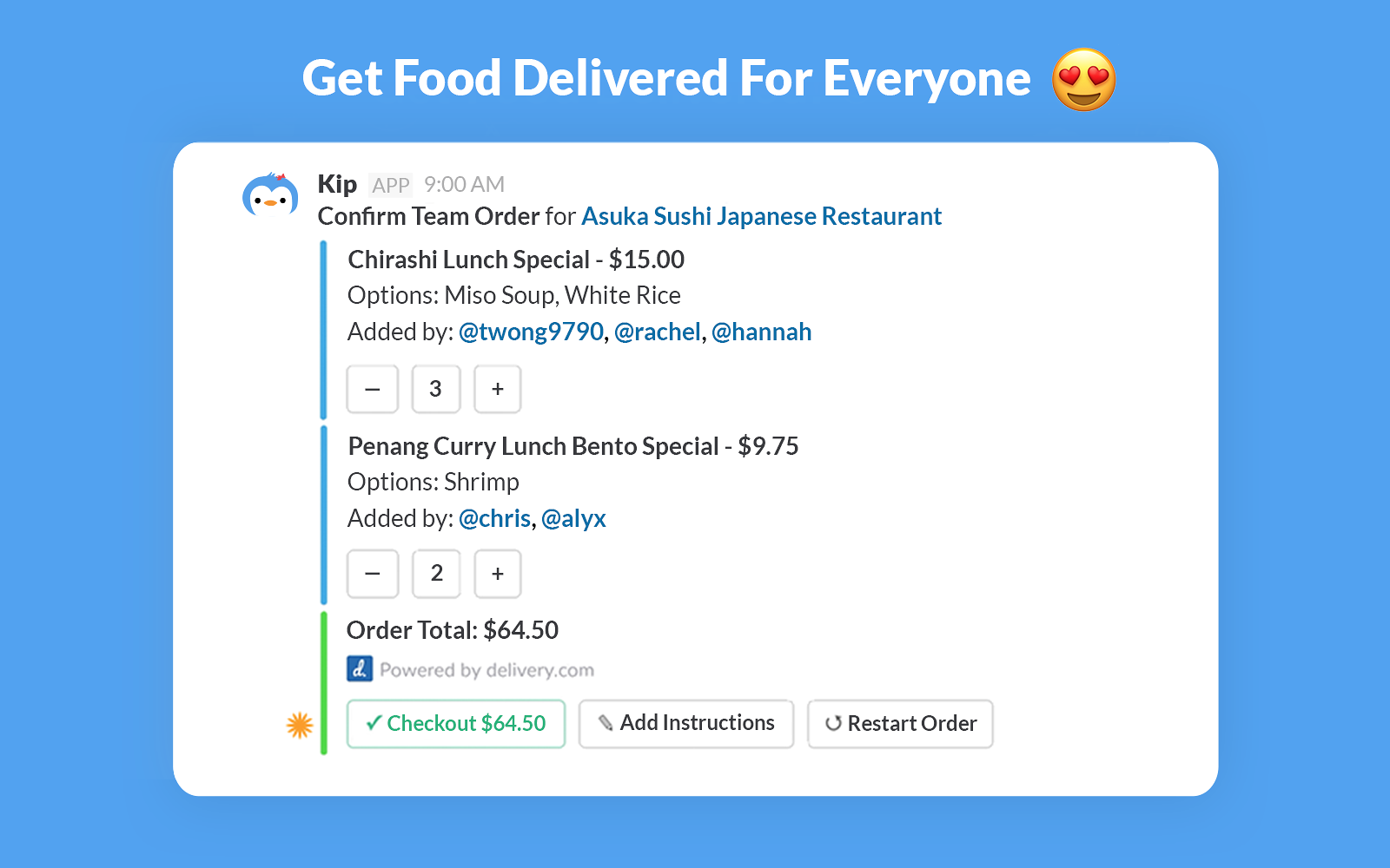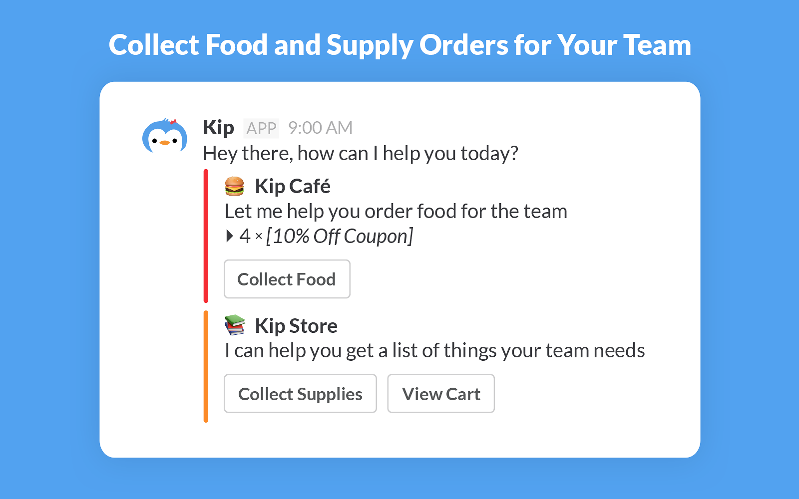 Kip is a smart assistant that helps you collect food orders and supplies for the team. Save time on follow-ups and get Kip to coordinate everything from ordering lunch to workplace essentials.- Set budgets with Kip! Decide how much you want to spend per order and Kip will easily manage it across all team members for you.- Use Kip to collect orders and send reminders instantly. No more frustrating back and forth conversations, Kip will DM each member and follow up on their requests.- Checkout orders directly in chat. Kip collects requests and essentials throughout the week and you can easily manage and view all items in cart by asking Kip.Spend less time on follow ups and more time building great products. Make team and workplace management easy with Kip.