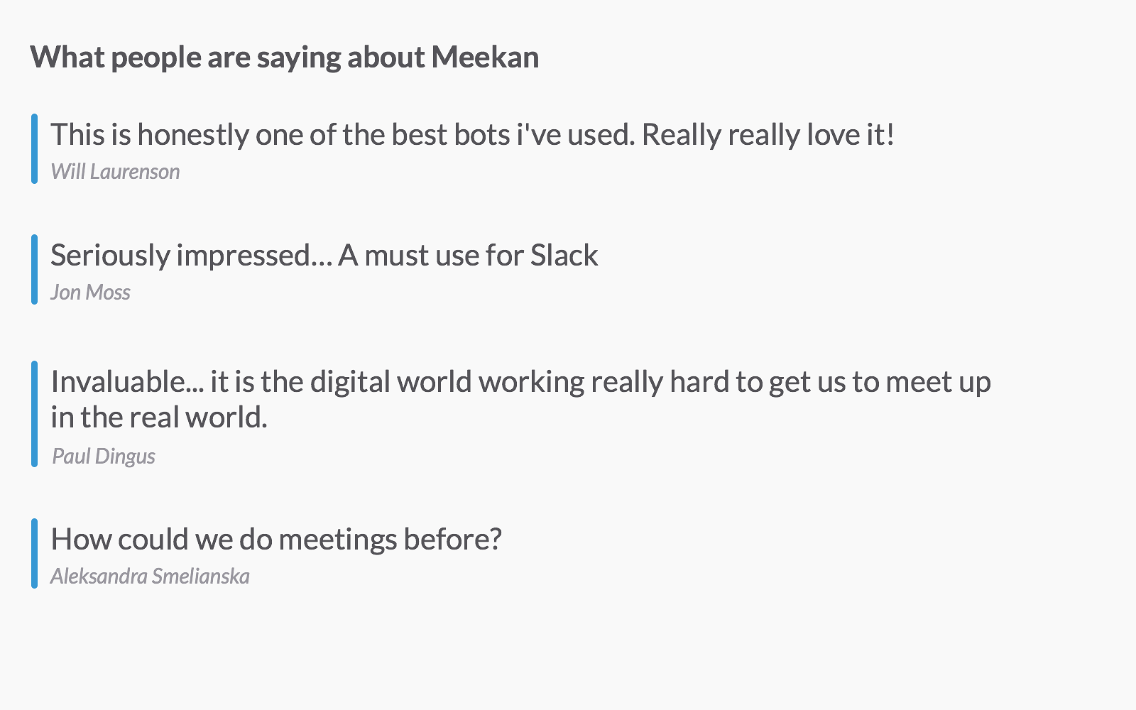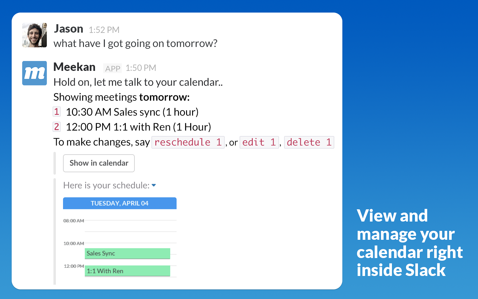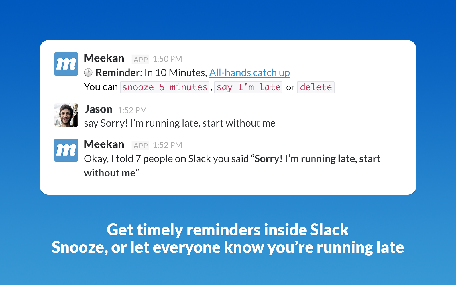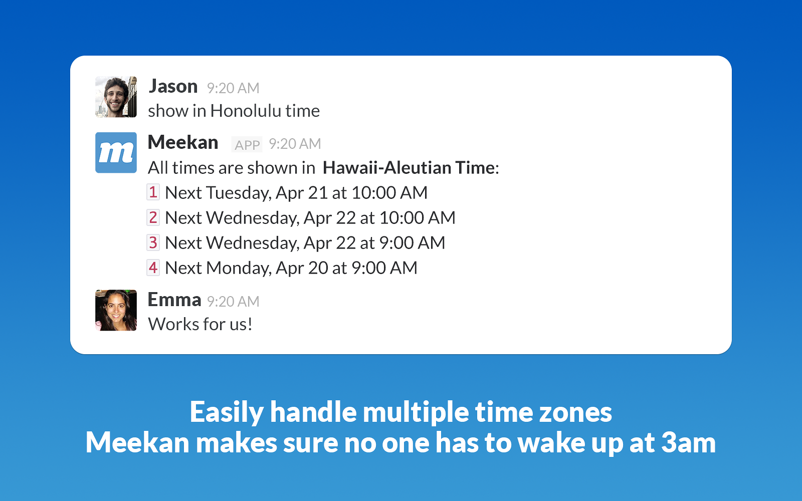 The world’s smartest AI scheduling assistant, matches everyone’s calendars in seconds.Meekan learns everyone’s availability and preferences to pinpoint the best time to meet every time. Easily work out time differences and find time to meet, even for the busiest teams. Add our bot to any of your Slack channels, and just ask for a new meeting:
