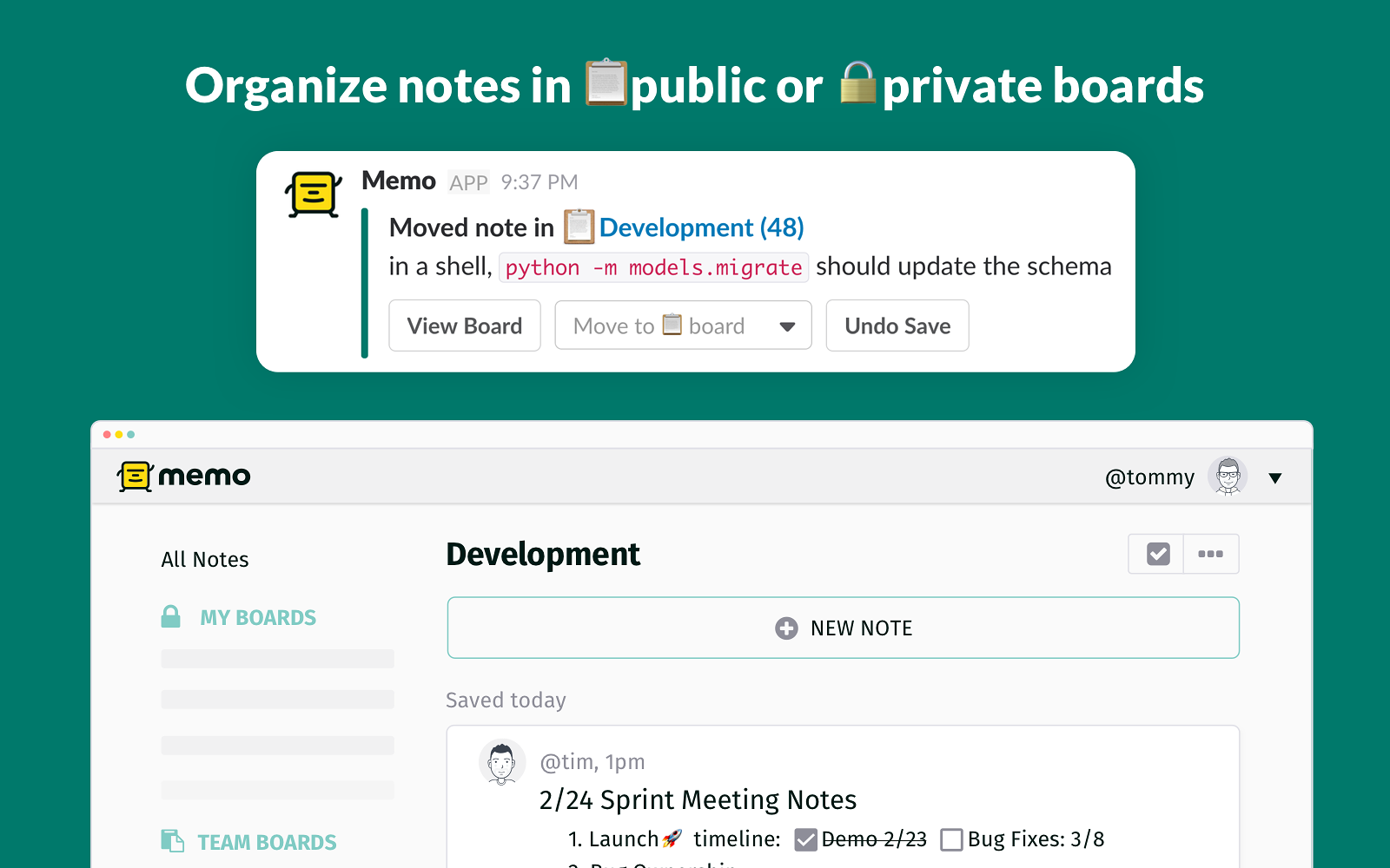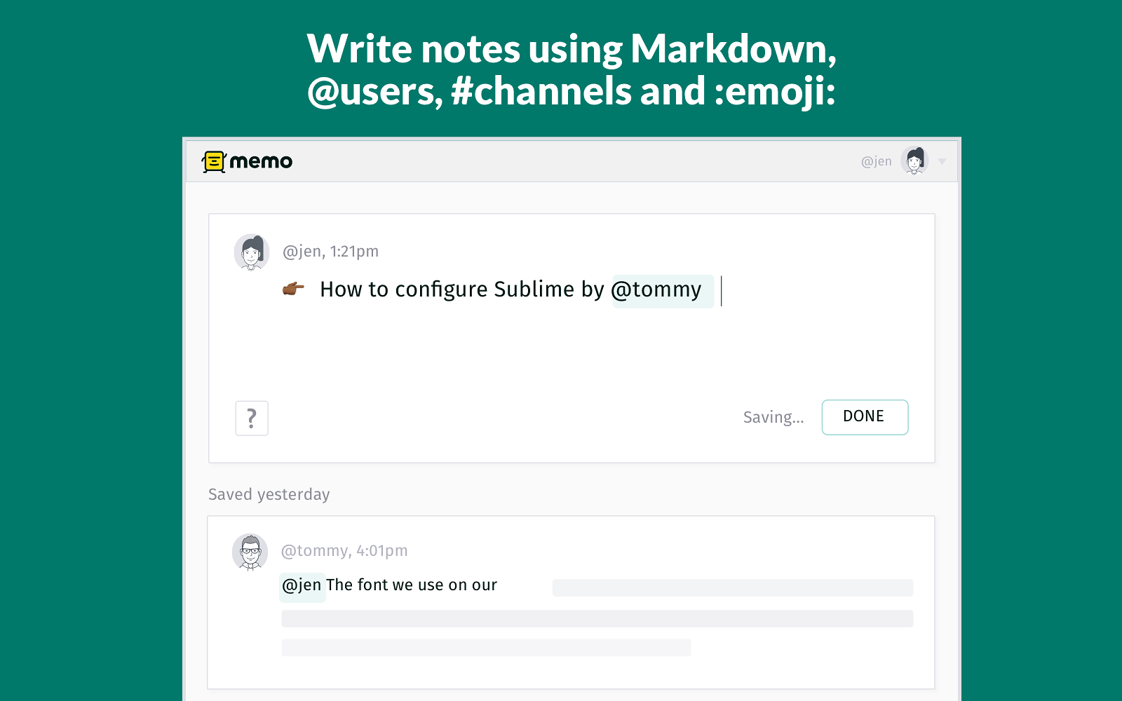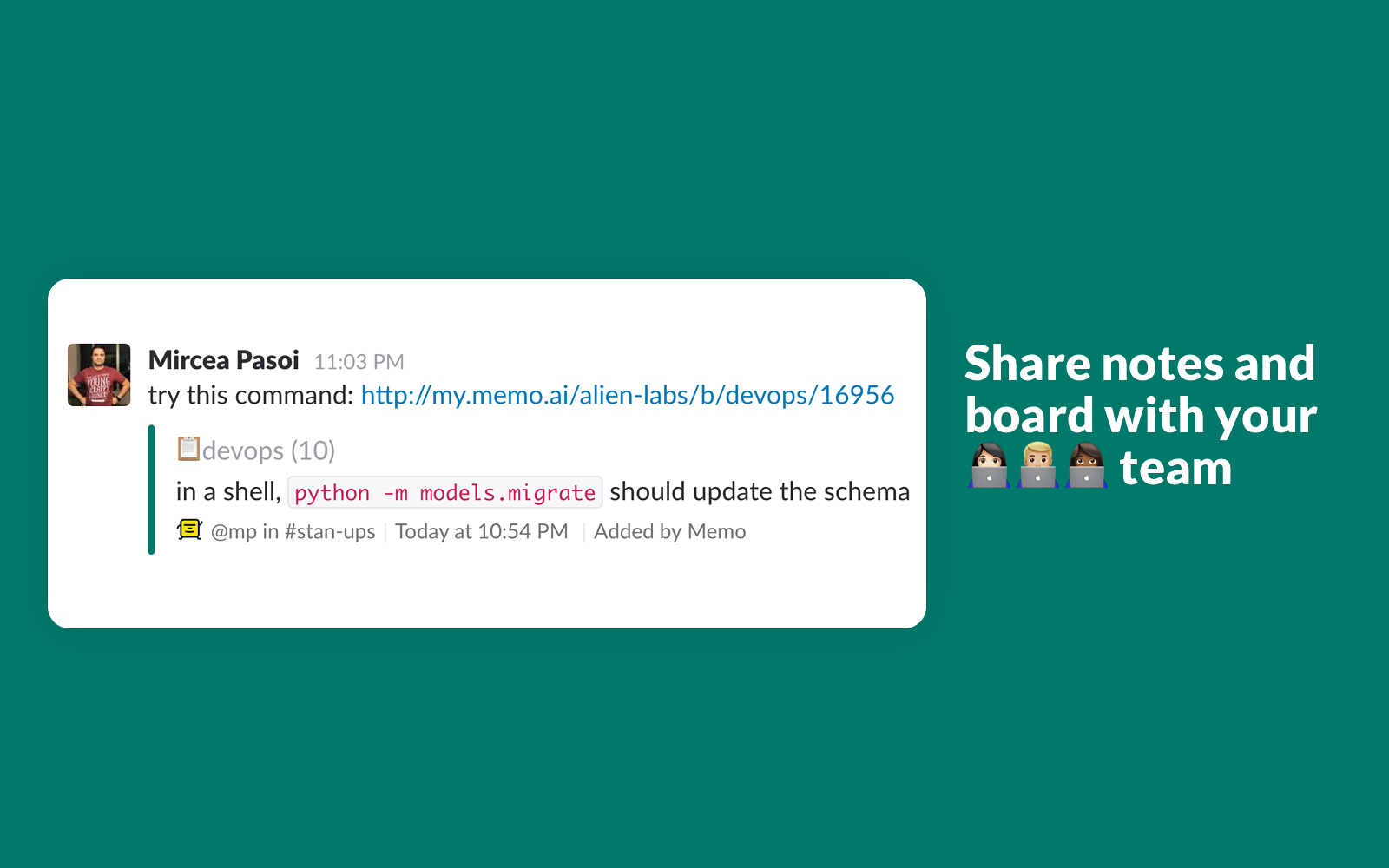 Sign InWith Memo it’s quick and easy to save and find code snippets, meeting notes, links, Slack messages, or other short work notes – right inside Slack or on the web. Notes can be kept private or shared with anyone on your team!