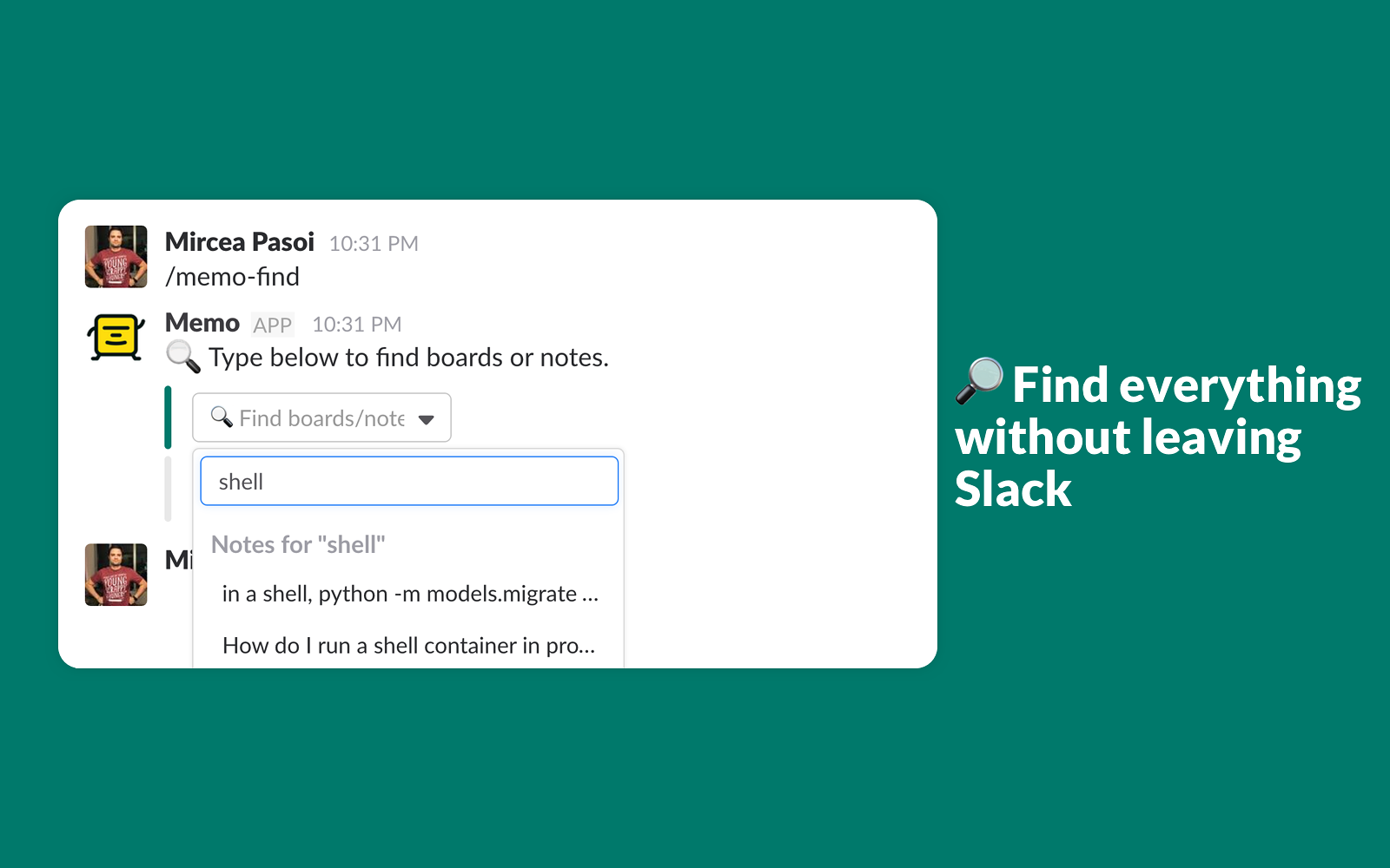 /memo-find followed by what you remember to find what you saved, without leaving Slack. Everything saved is searchable by