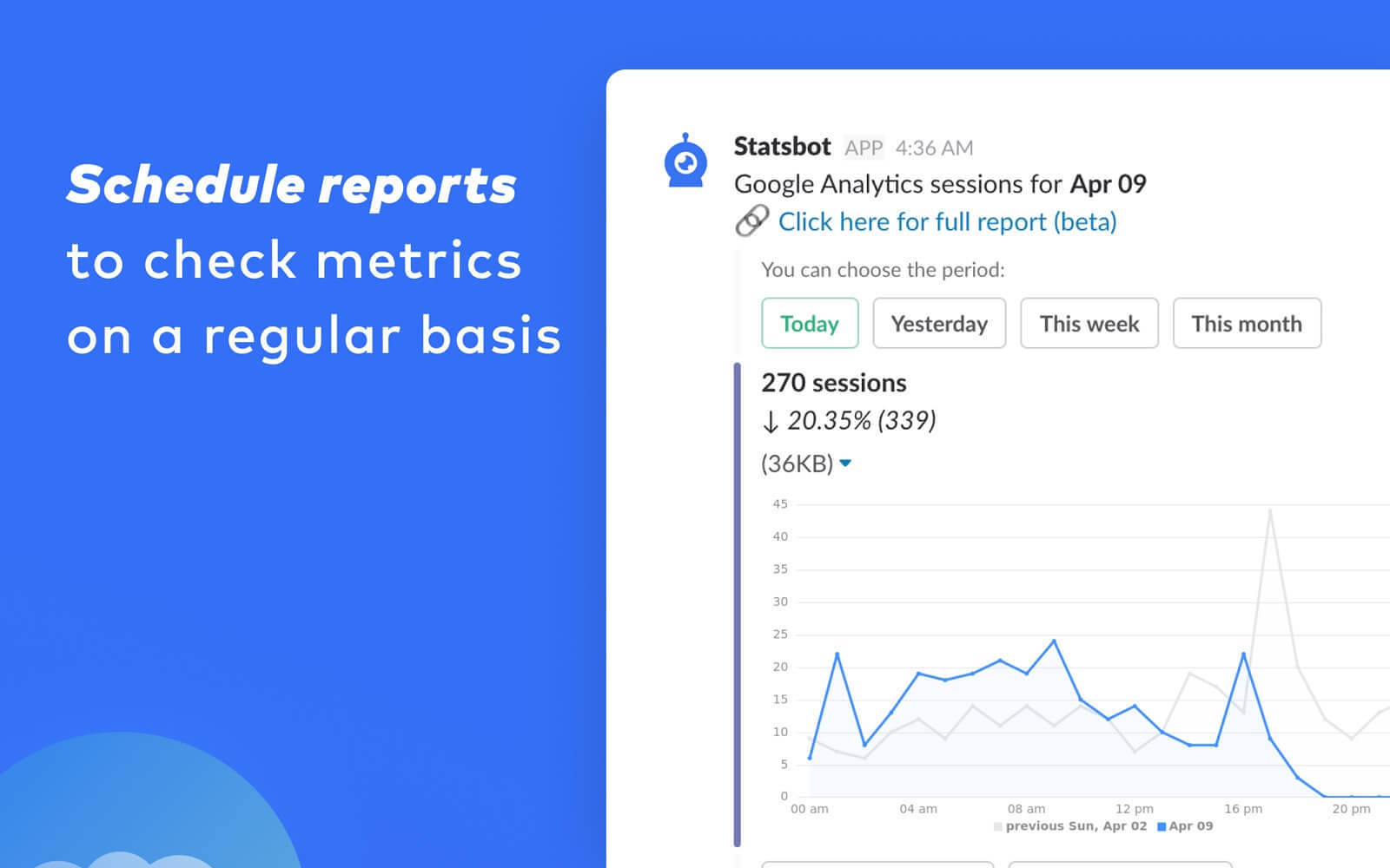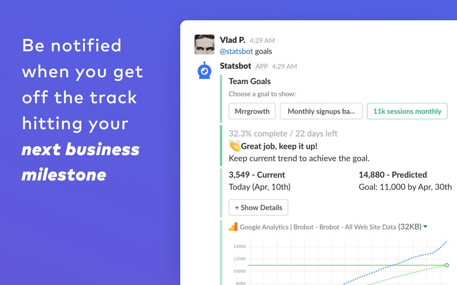 Statsbot is your personal analytics assistant powered by AI, that gives you data insights right into Slack.:white_check_mark: It helps businesses to receive analytics insights via natural language, track metrics, make data-driven decisions, and achieve goals. :white_check_mark: Statsbot connects to a variety of platforms such as Google Analytics, Stripe, SQL, Salesforce, Mixpanel, and many others.:white_check_mark: Free trial is available :wink: