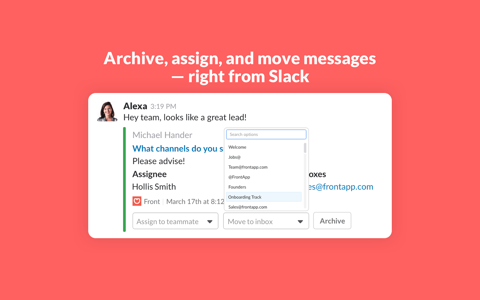 Our Slack integration makes it easy to send messages from Front to Slack, where you can archive, assign, or move them to another Front inbox. Two-way activity sync makes it easy for teams to reach inbox zero directly from Slack.How it works