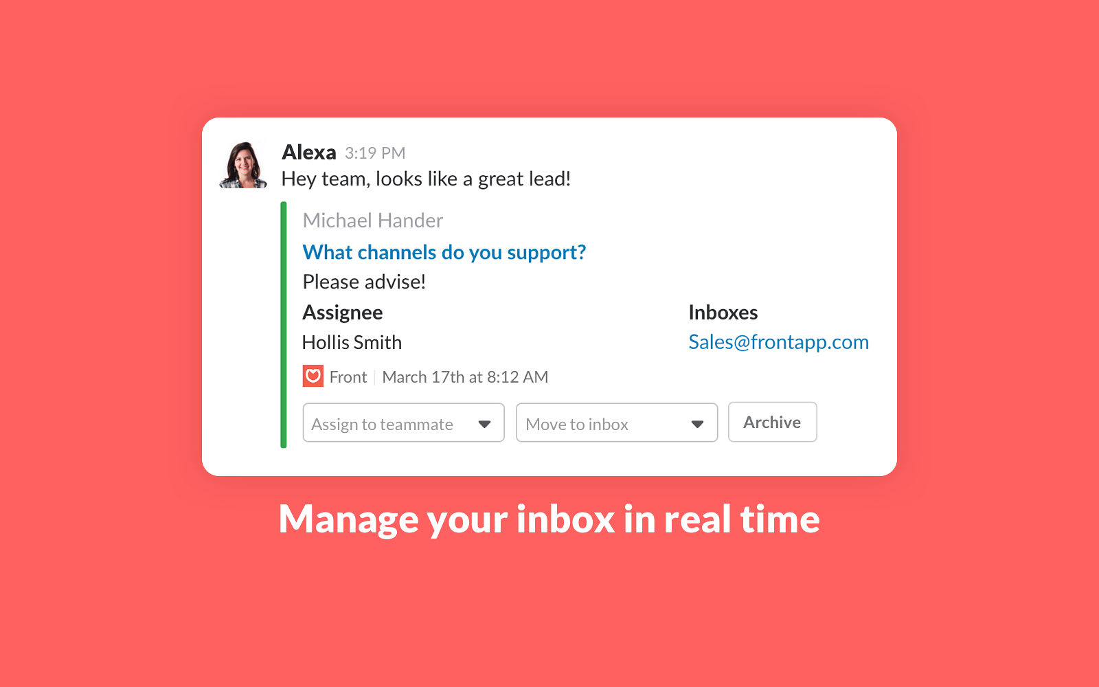Front is the first inbox for teams that brings all your external communications into one place. With Front, teams across the company can manage all of their communication channels — email, social media, chat, voice, and more — and collaborate around every conversation. Front + Slack