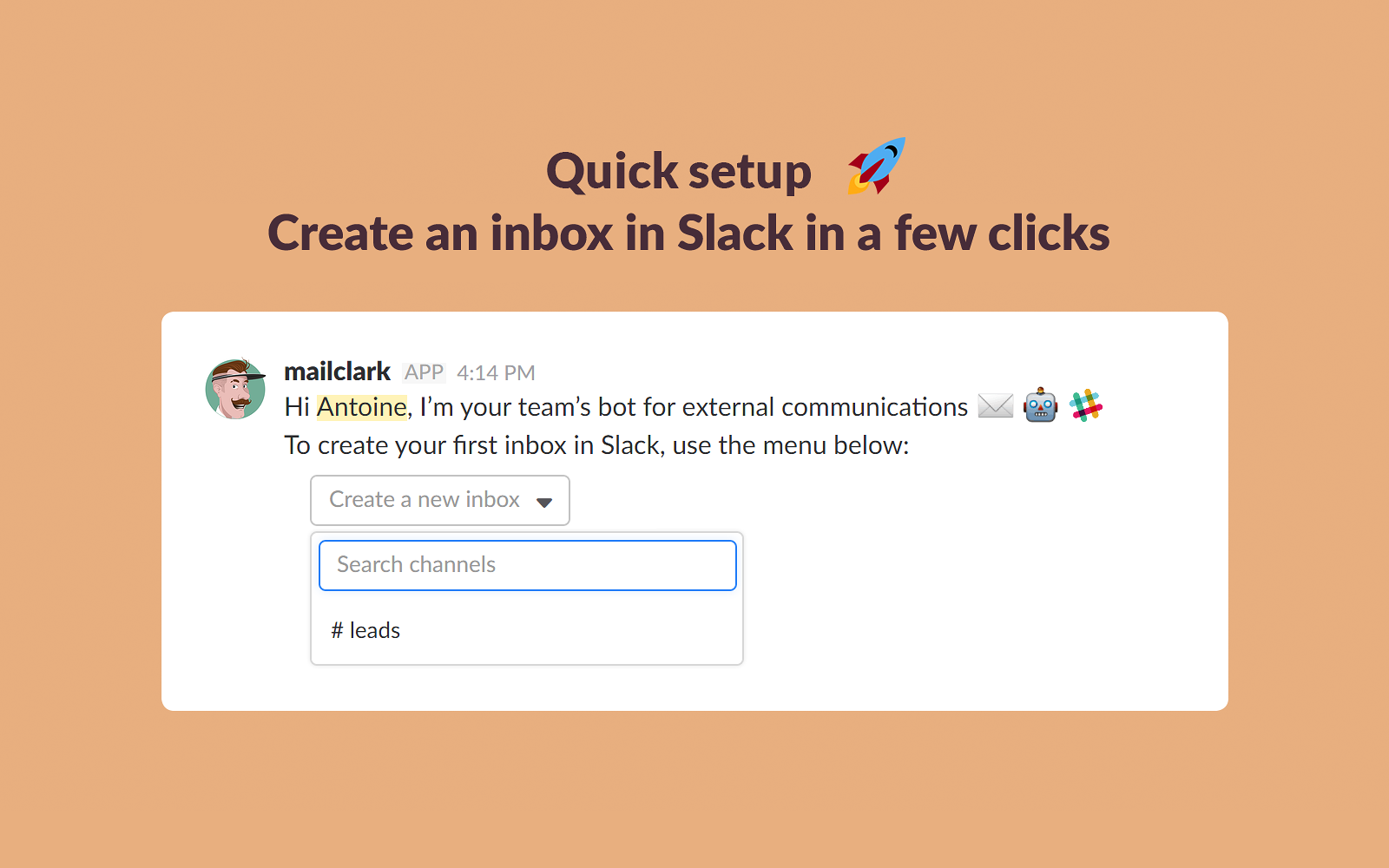 Getting started is easy: use the Menu to create your first inbox in Slack in a few clicks.