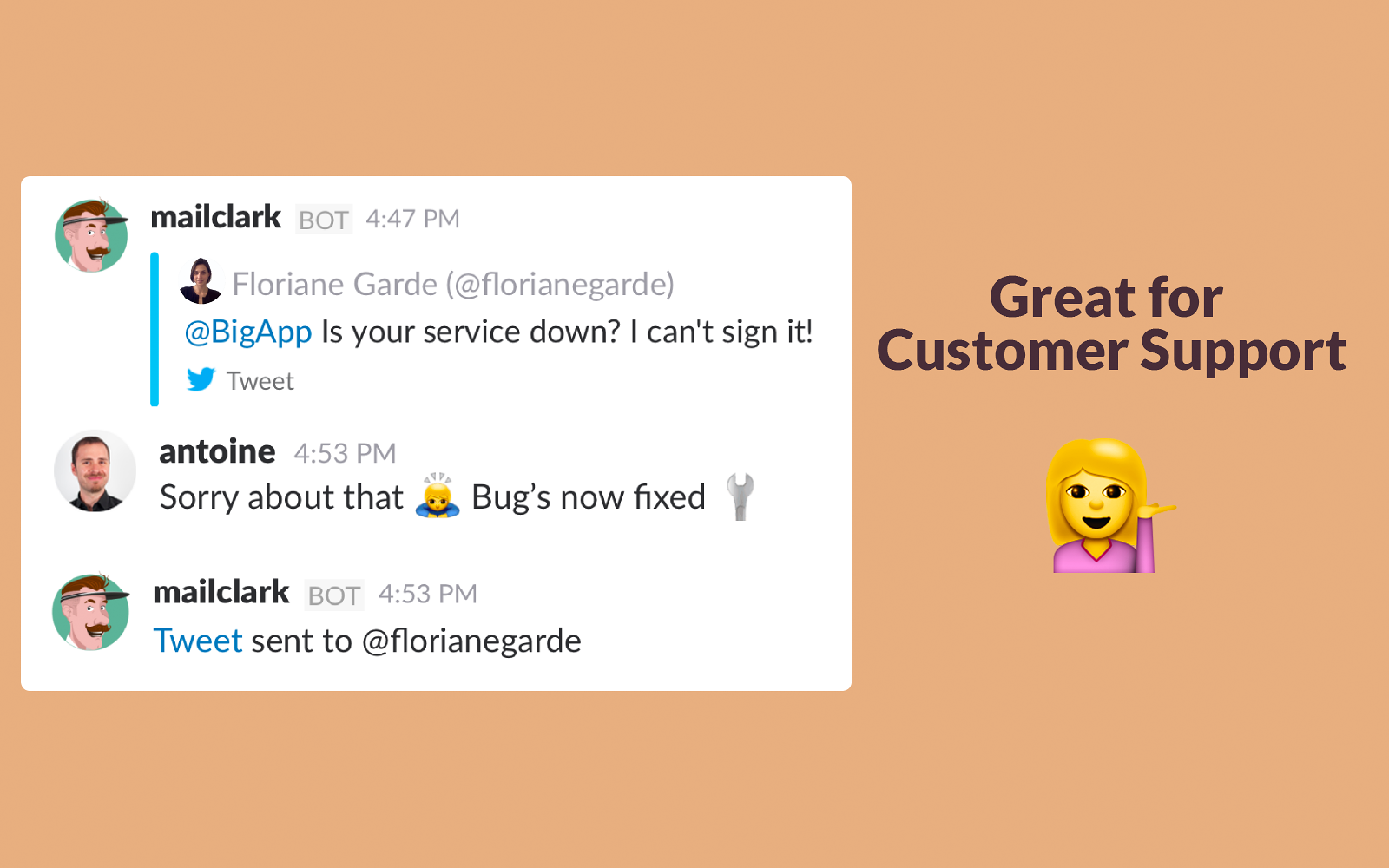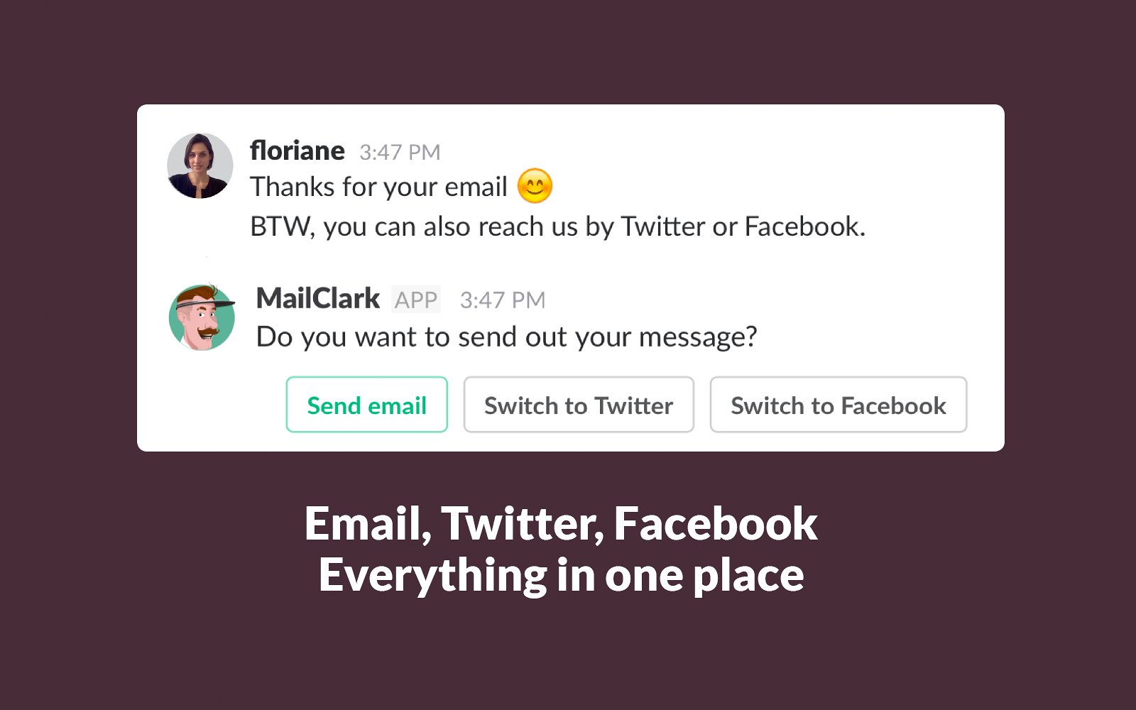 send & receive emails, Facebook messages, tweets & Twitter DMs without ever leaving Slack.