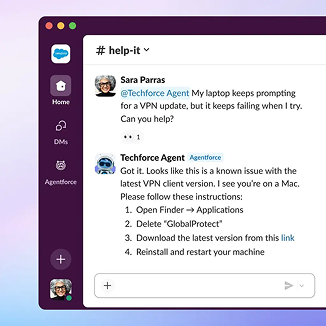 Salesforce’s IT department handles a mountain of requests each month, supporting employees when they need new devices, tools, licenses, and more. By plugging in the Techforce IT Agent, our IT team has more time to focus specifically on complex issues that require human expertise.