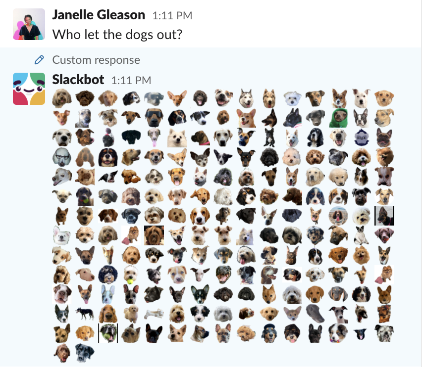 If an owner or admin has enabled this option, you and your coworkers can add a variety of custom responses to use in channels from the Customize Your Workspace page. When members use your chosen unique words and phrases, Slackbot will respond with the phrases, emoji, or image links of your choosing.