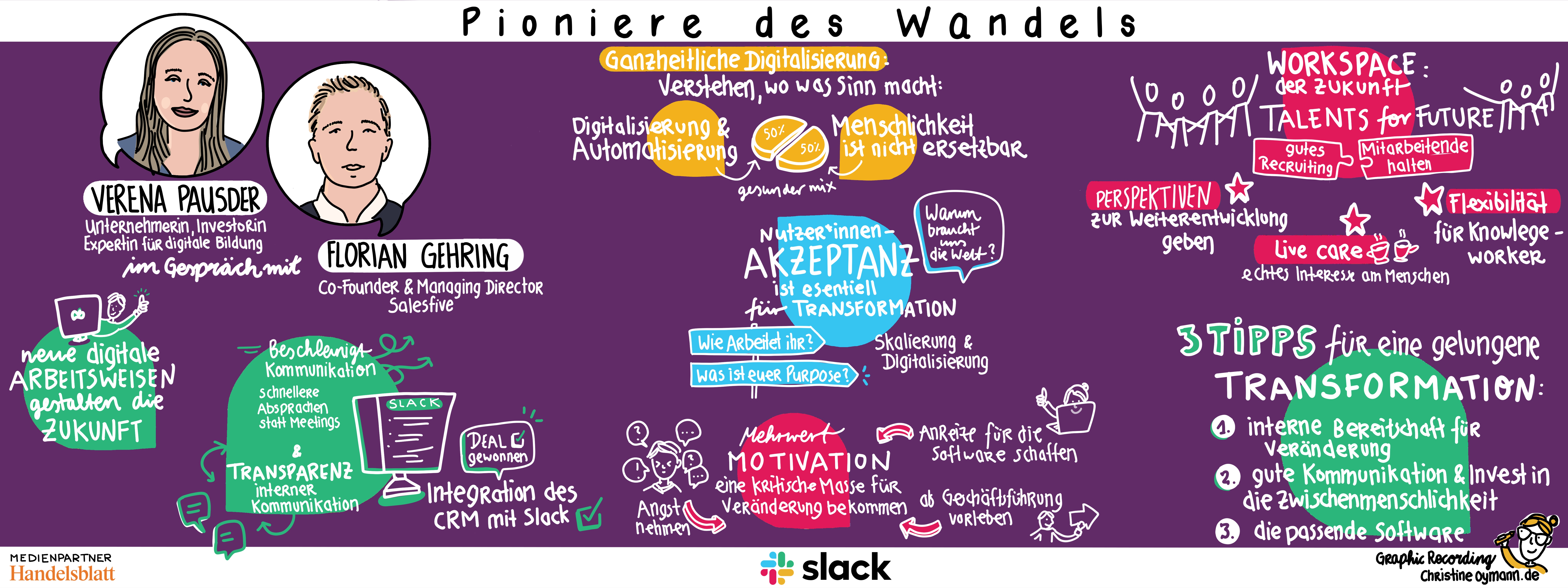 Aus eigener Erfahrung als Unternehmer, aber auch durch seine Arbeit mit den Kunden, hat der Salesfive-Geschäftsführer drei Tipps parat, wie sich Digitalisierungsprojekte am besten umsetzen lassen. Als ersten Punkt nennt er die interne Bereitschaft, dass etwas geändert werden muss – und das nicht nur auf Management-Ebene, sondern in allen Abteilungen. Fürsprecher sind dafür ein wichtiger Faktor. „Der zweite extrem wichtige Punkt ist, dass das Zwischenmenschliche mit dem Digitalisierungspartner stimmt und Beratung auf Augenhöhe stattfindet“, erklärt er. Als dritten Rat empfiehlt er bei der Technologie eine Plattform zu wählen, die alle Daten an einem Ort bündelt und skalierbar ist. Denn nur wenn die 50 Prozent Technologie stimmen, können die anderen 50 Prozent Mensch Digitalisierung stemmen.