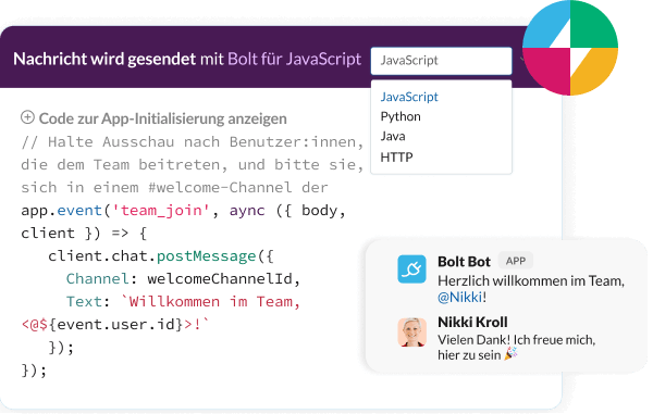 Mit Slack CLI für das Lebenszyklusmanagement und Bolt für die App-Entwicklung vereinfacht die Slack-Plattform den Entwicklungsprozess. Entwickler:innen können Backend-Dienste ausführen, sich über Heroku vernetzen oder modulare Komponenten erstellen, um eine vollständige Anpassung an die Arbeitsweise deiner Organisation zu gewährleisten.