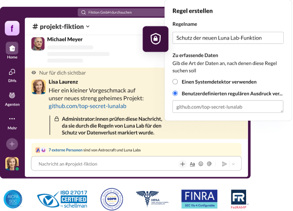 Sicherheit auf Enterprise-Ebene ist bei Slack Standard, einschließlich robuster Funktionen für Governance, Risikomanagement und Konformität zum Schutz deines Unternehmens. Mit strengen Adminkontrollen wie Einmaliges Anmelden, Enterprise Mobility Management und Schutz vor Datenverlust sorgen wir dafür, dass deine Daten sicher bleiben.