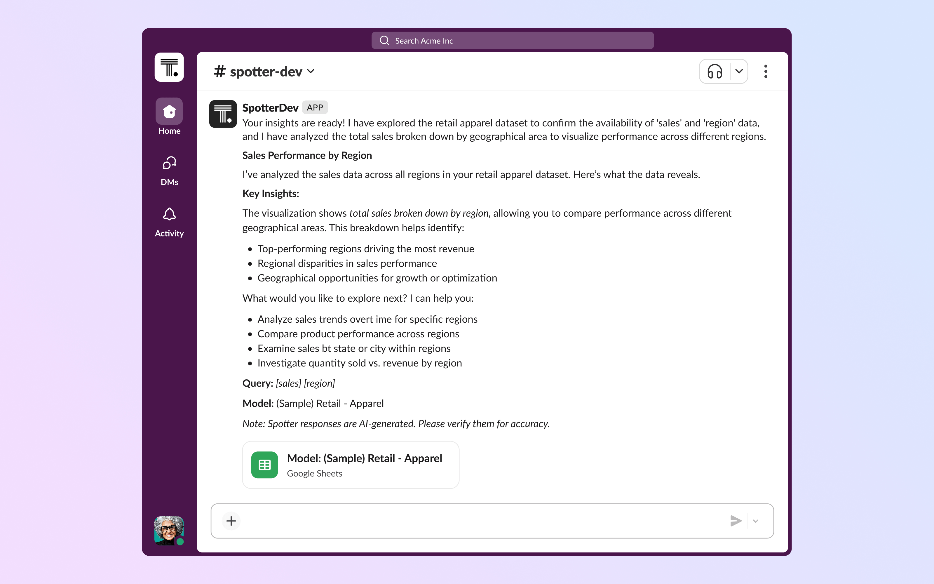 - Spotter ist ein Business-Intelligence-Agent von ThoughtSpot, der den MCP-Server von Slack nutzt, um Echtzeit-Unternehmensdaten auf sichere Weise mit Slack-Unterhaltungen zu verknüpfen und so umsetzbare Erkenntnisse aus Gesprächen zu extrahieren. Teams können Spotter Fragen in natürlicher Sprache stellen und der Agent analysiert Daten wie z. B. Bestandsmengen in Lieferketten, Produktperformances und viele weitere. Dann stellt Spotter die Analyseergebnisse direkt in Slack-Channels bereit, sodass Entscheidungen immer auf den neuesten Erkenntnissen basieren.