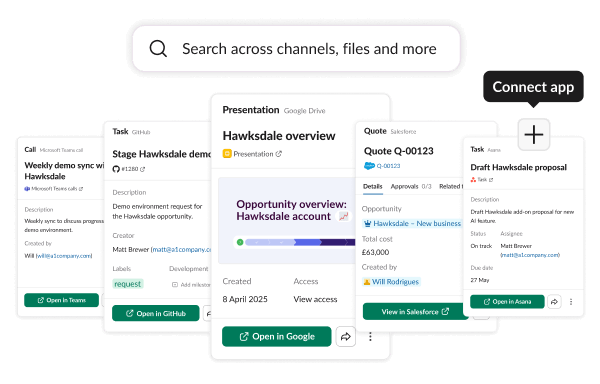 ‘We need a single pane of glass for all our data sources across our different systems. Enterprise search in Slack delivers exactly that. With the help of AI, we can surface all the right information directly in front of our users.’