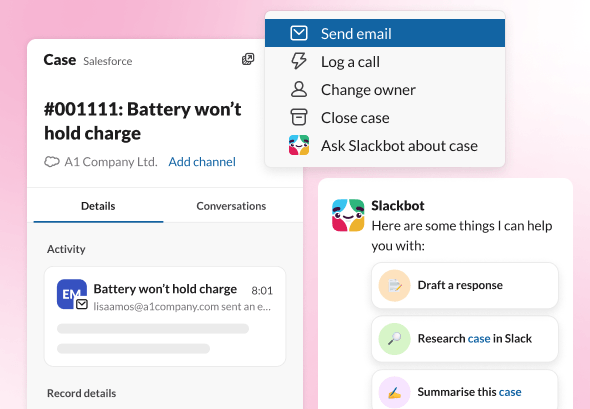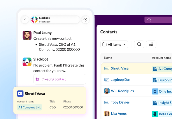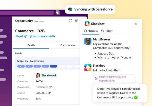 Slackbot knows your channels, conversations and customers, and can take instant action based on your prompts. Create a new account, log notes from a recent call and update your records, all in Slack – all you have to do is ask.
