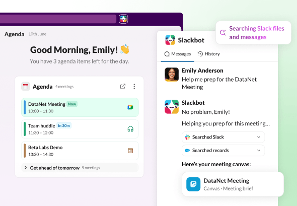 Research accounts, prep meetings and draft follow-ups in seconds. With a simple ask, Slackbot tackles the donkey work and keeps data up to date, so your team can spend more time building relationships.