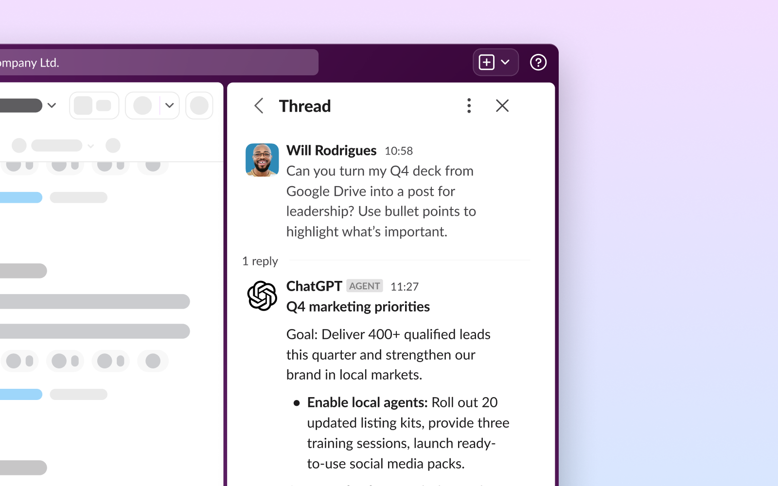- Boost productivity: Build your AI and agents directly into Slack, unifying your tech stack. This means fewer clicks, less wasted time and more focus on work, all from the place where your conversations are already happening.