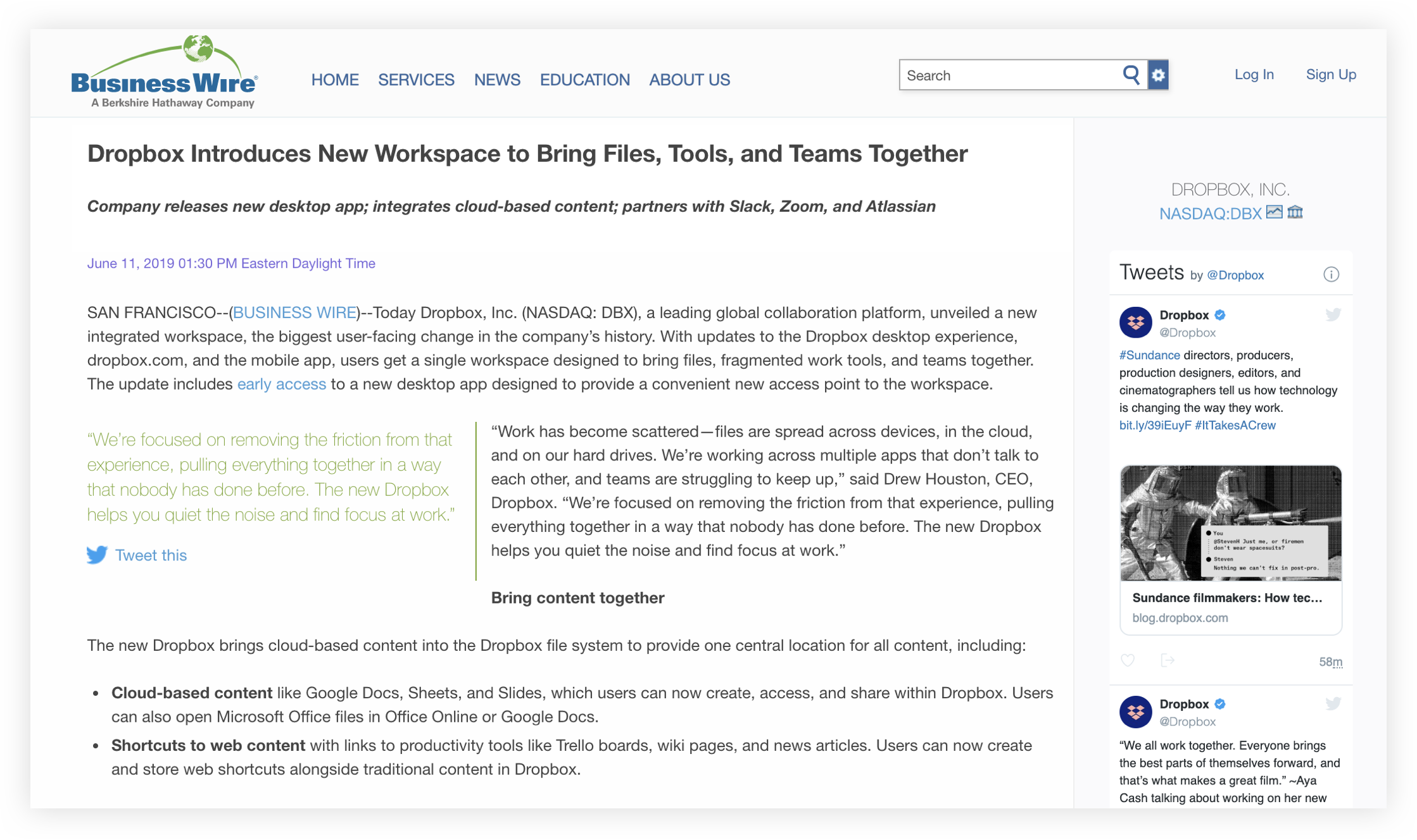 Press release example: “Dropbox Introduces New Workspace to Bring Files, Tools, and Teams Together“