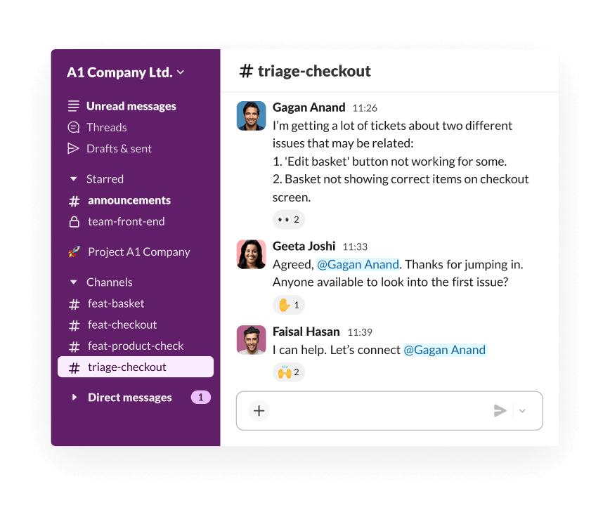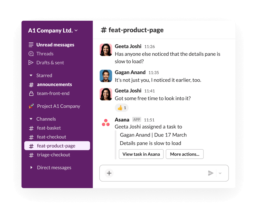 Collaboration in Slack happens in real time – you can find support or delegate tasks in the flow of conversation. And when those conversations happen in channels, you can prioritise your effort on just the tasks and work that need your attention.