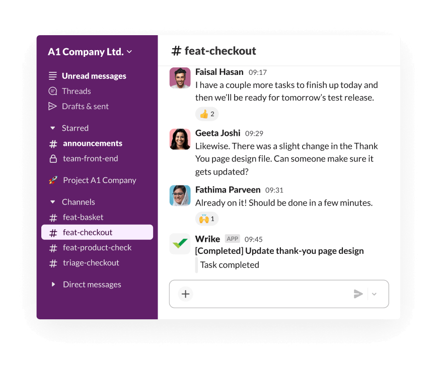 You can use Slack for all your task management needs. From task reminders to specific channels for project updates to seamless team collaboration, Slack helps you to never miss a task or deadline. Go further by integrating with thousands of tools, such as Asana, Wrike, Monday.com and many more to manage every task in Slack, your productivity platform.