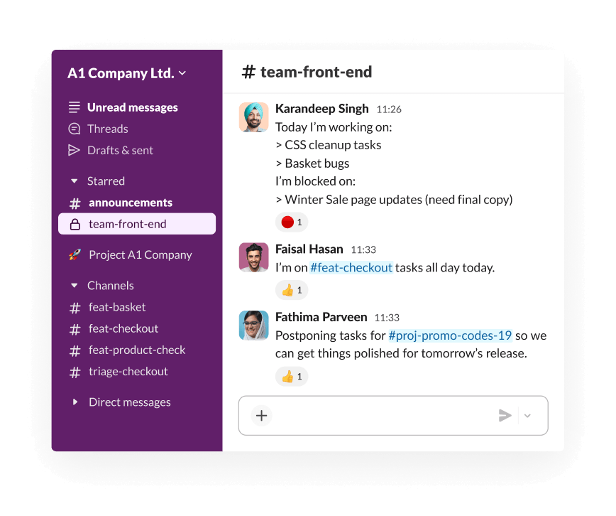 Work in Slack happens in collaborative spaces called channels. Conversations and files related to your tasks stay organised in the appropriate channel for that project or initiative, allowing you to focus on specific tasks and manage your time as needed.