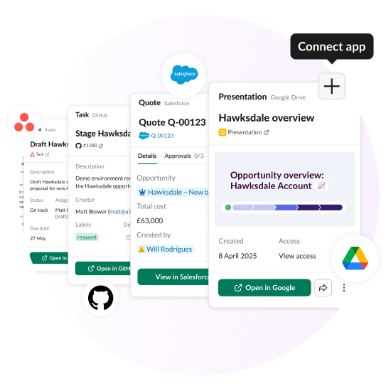 Work objects reimagine how app data is shared in Slack. Instead of a simple link, you’ll get rich, interactive previews inside your conversations from apps like Asana, Pagerduty, Box and Highspot. Edit records, mark tasks as complete and even approve requests, all in one place.