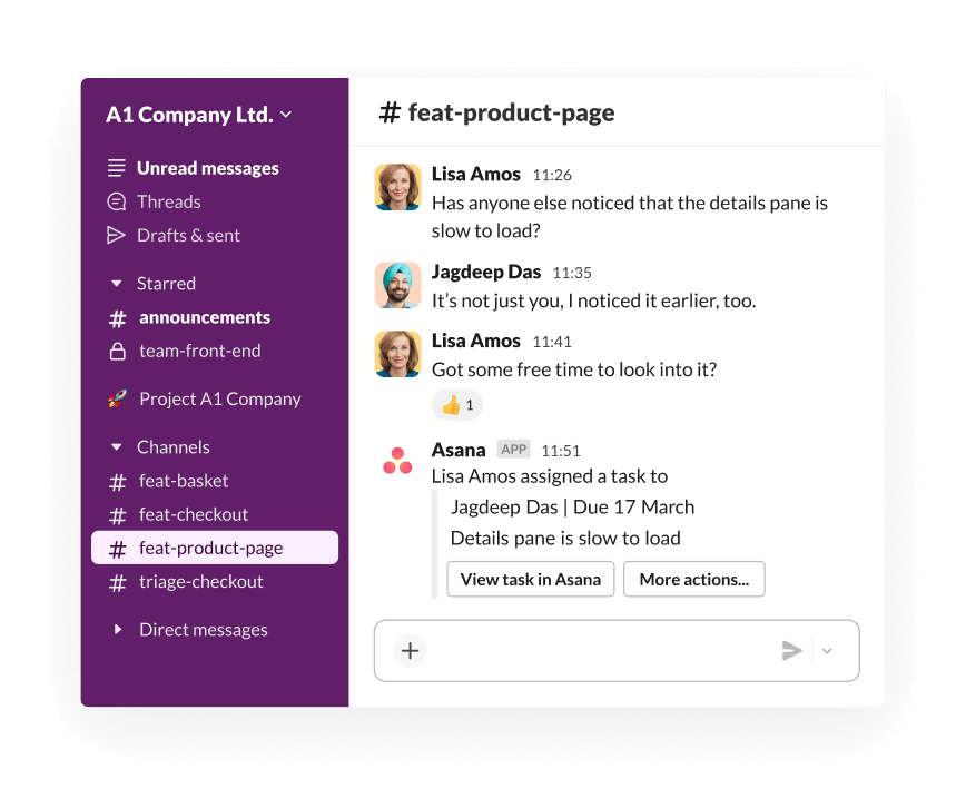 Integrations, such as Asana, help you create and assign tasks from messages in Slack, perfect for incident management channels.