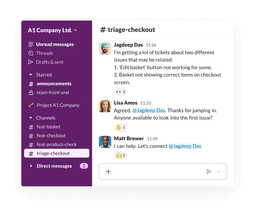 Collaboration in Slack happens in real time – you can find support or delegate tasks in the flow of conversation. And when those conversations happen in channels, you can prioritise your effort on just the tasks and work that need your attention.