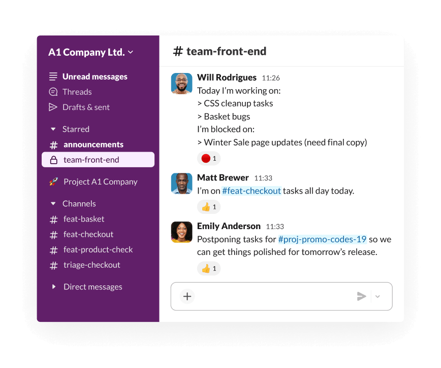 Work in Slack happens in collaborative spaces called channels. Conversations and files related to your tasks stay organised in the appropriate channel for that project or initiative, allowing you to focus on specific tasks and manage your time as needed.