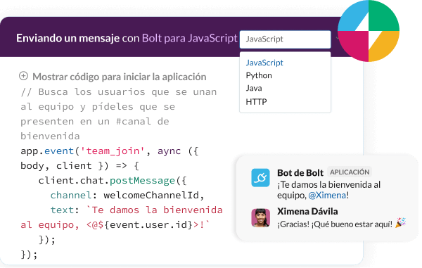 La plataforma de Slack simplifica el proceso de desarrollo con la CLI de Slack para la administración del ciclo de vida y Bolt para el desarrollo de aplicaciones. Los desarrolladores pueden ejecutar servicios de backend, conectarse mediante Heroku o crear componentes modulares, lo que garantiza una personalización completa para lo que necesita tu organización.