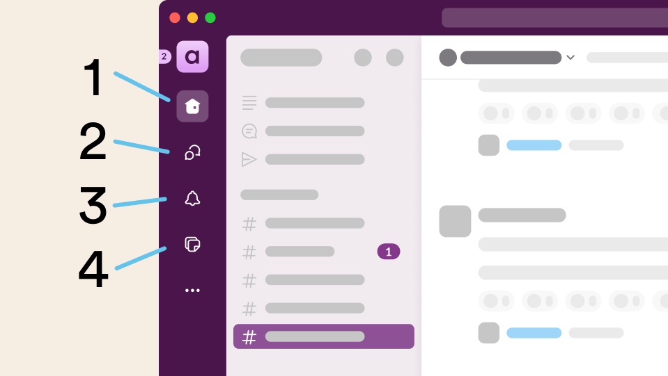En la barra lateral, puedes acceder a los canales a los que te has unido, abrir tus mensajes directos y ver la actividad que puede requerir atención, así como consultar una lista de elementos guardados y recordatorios.