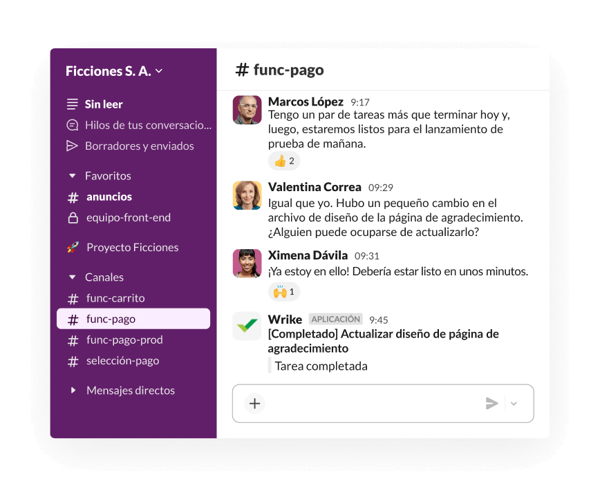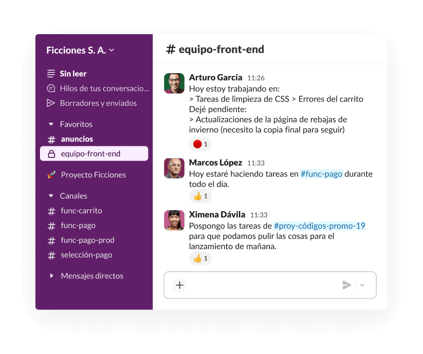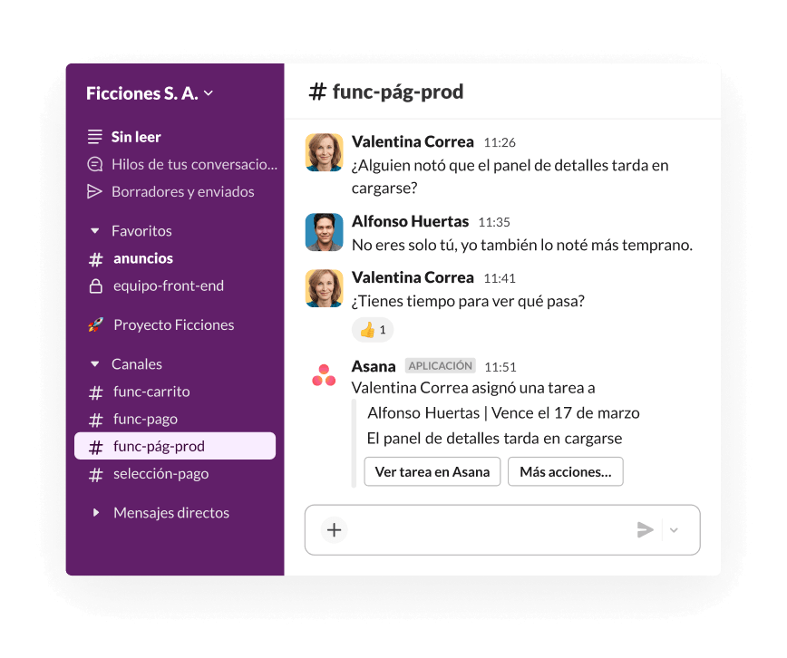 La colaboración en Slack ocurre en tiempo real: puedes recibir asistencia o delegar tareas en el flujo de la conversación. Y cuando esas conversaciones suceden en canales, puedes priorizar tu esfuerzo en las tareas y el trabajo que requieren tu atención.
