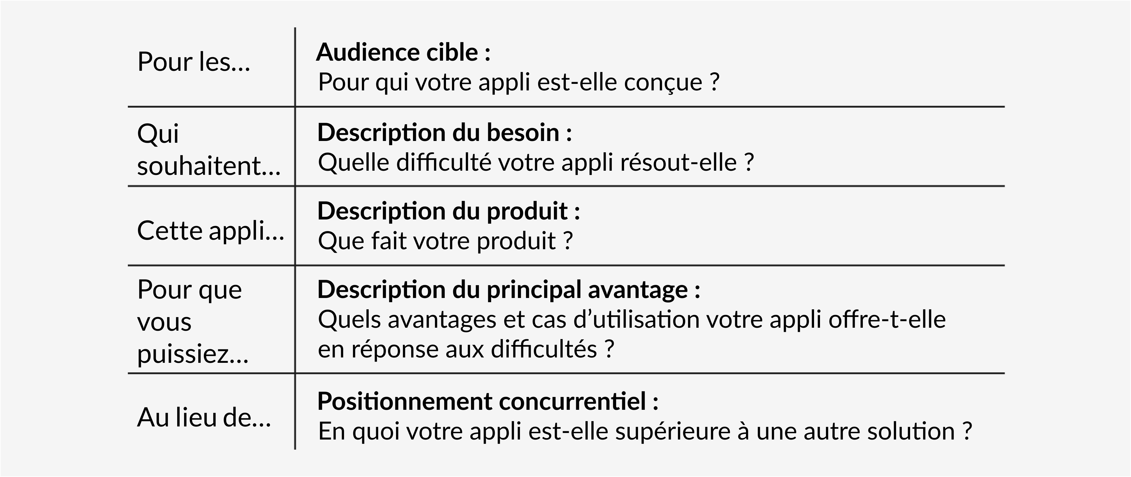 Ensuite, expliquez en quoi votre solution est différente des produits qui existent déjà sur le marché et elle leur est supérieure. (C’est ce que les professionnels du marketing appellent la différenciation du produit.) Vous pouvez résumer tout cela dans un énoncé de positionnement qui décrit les avantages de votre appli dans le contexte des difficultés qu’elle résout pour les clients.