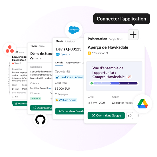 Ces intégrations contribuent à faire de Slack un centre de collaboration, de communication et de productivité en le connectant aux outils que les équipes utilisent tous les jours.