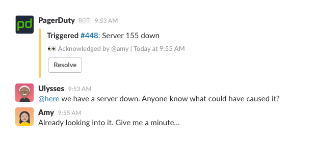 Ajoutez à Slack les outils de contrôle pour vous assurer que les personnes concernées voient les alertes et les notifications urgentes. Par exemple, associez PagerDuty au canal #exploitation pour que les membres soient avertis dès qu’un serveur tombe en panne et pour qu’ils puissent discuter de toutes les solutions possibles, tout en surveillant les données en temps réel, le tout de façon centralisée.