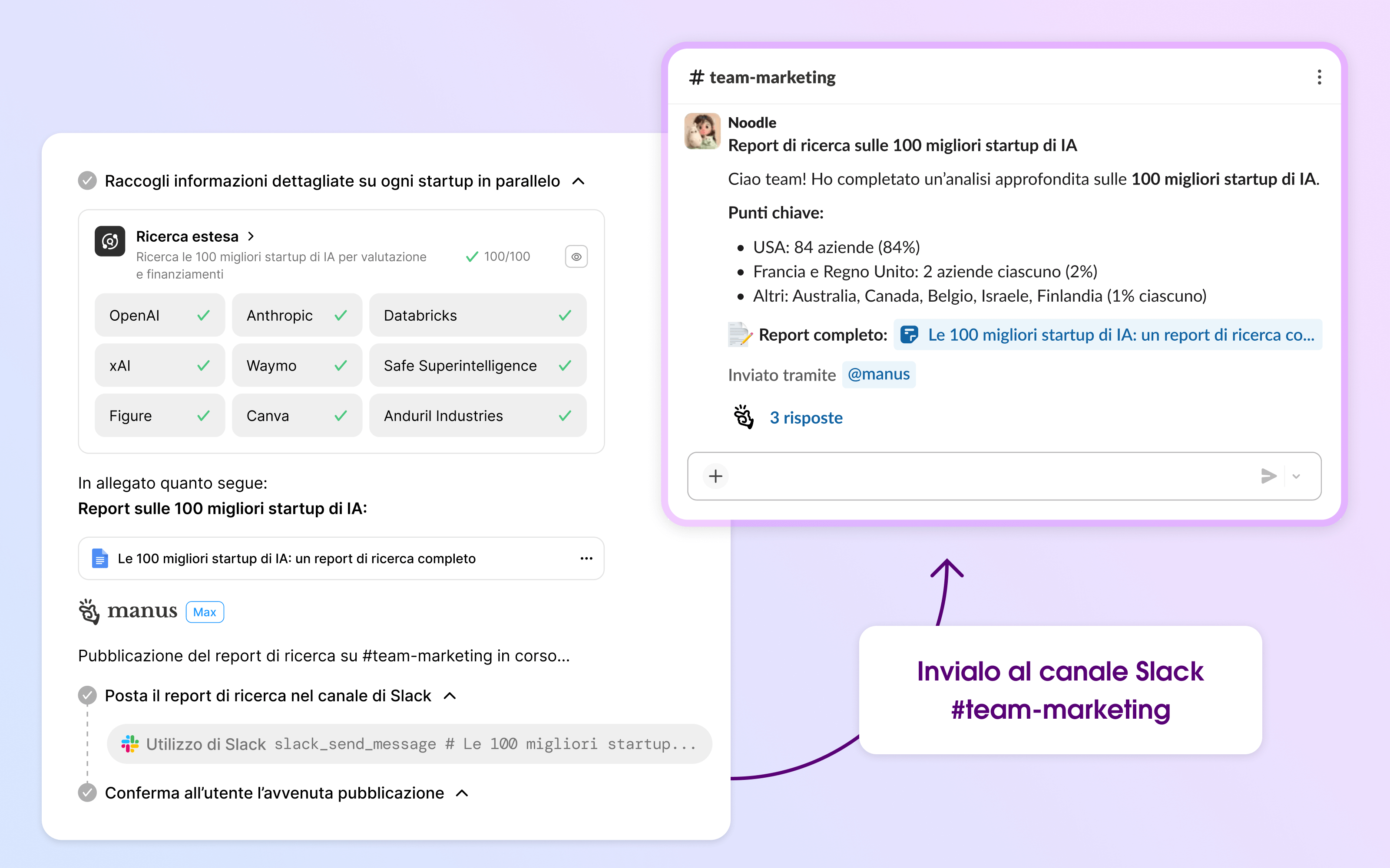 - Manus è un agente di IA generale autonomo progettato per completare attività e produrre risultati. Grazie al connettore Slack di Manus, può leggere i canali, estrarre informazioni chiave, trasformare le discussioni in azioni concrete e condividere i risultati con il tuo team, il tutto tramite semplici comandi in linguaggio naturale. È come avere un assistente personale che conosce a fondo il tuo team.