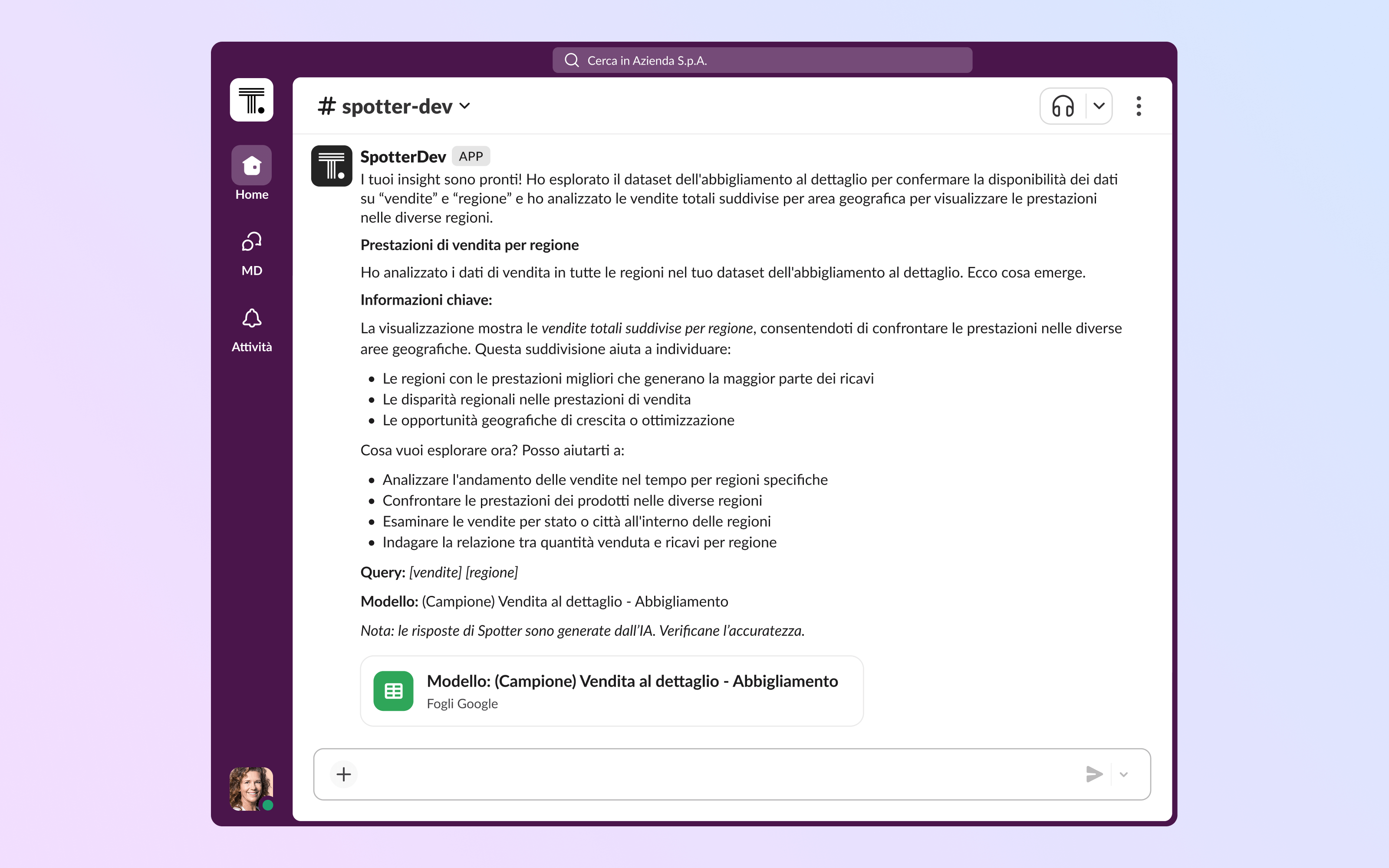 - Spotter è un agente di business intelligence di ThoughtSpot che utilizza il server MCP di Slack per connettere in modo sicuro i dati aziendali in tempo reale con le conversazioni di Slack, trasformando le discussioni quotidiane in informazioni fruibili. I team possono porre domande a Spotter in linguaggio naturale e analizzare dati come livelli di inventario della supply chain, performance dei prodotti e molto altro, per poi condividere i risultati delle analisi direttamente nei canali di Slack, in modo che le decisioni siano sempre basate sulle informazioni più recenti.