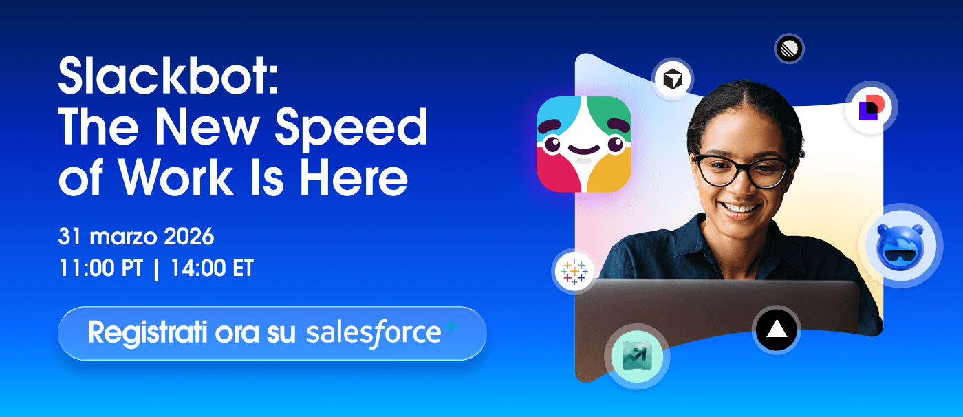 Scopri tutte le nuove funzionalità di Slackbot e unisciti a noi partecipando a un webinar il 29 gennaio per scoprire come l’agente di IA può cambiare la giornata lavorativa di ogni impiegato. Per trovare il piano giusto per il tuo team, contatta ora le Vendite.
