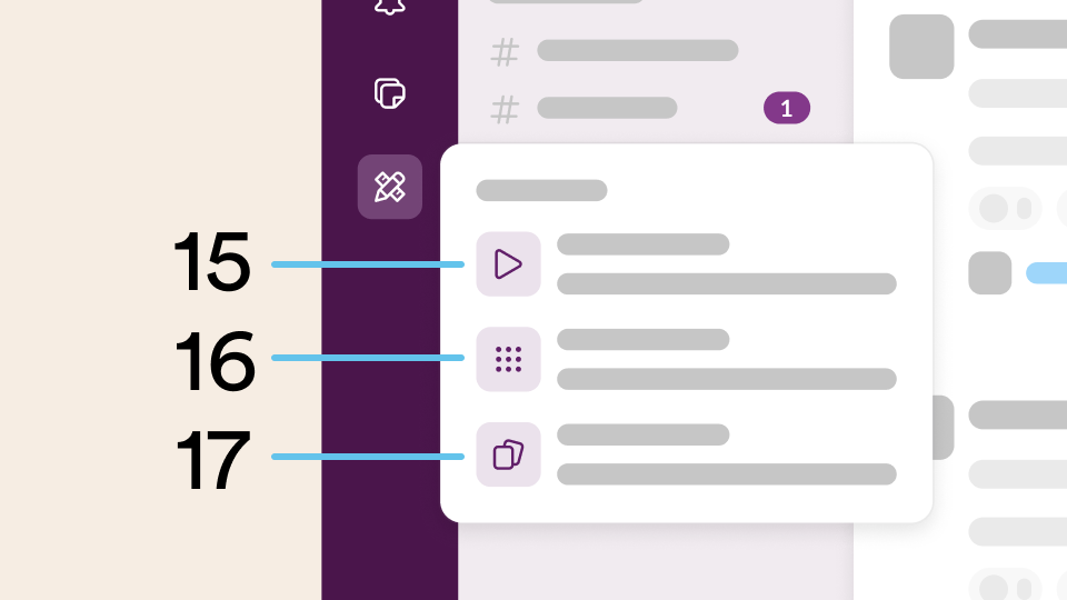 Costruisci o usa i workflow per automatizzare le attività quotidiane e i processi in Slack. Prova a utilizzare i modelli di workflow per raccogliere le informazioni con un modulo o crea il tuo workflow personale per gestire un processo per il tuo team.Le app collegano altri strumenti che utilizzi (quali Google Calendar o Zoom) a Slack. Trova nuove app su Slack Marketplace o esplora la pagina App nella scheda Strumenti per vedere le app già disponibili nella tua area di lavoro. Utilizza un modello per creare un canale per uno scopo specifico. I modelli di canale raggruppano canvas, elenchi e workflow per portare a termine qualsiasi attività.