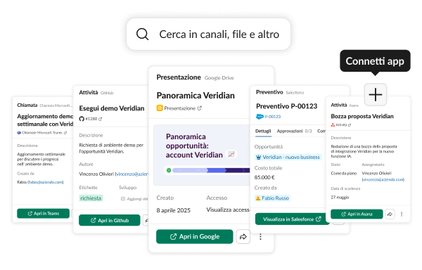 Con la ricerca aziendale, Slack apre le porte alle conoscenze collettive della tua azienda. Esegui ricerche nelle conversazioni, negli strumenti aziendali e nei dati, tutto tramite un’unica barra di ricerca in Slack.