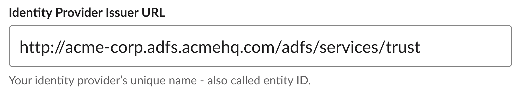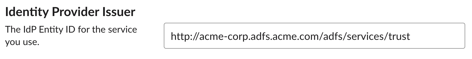 - Inserisci l’emittente del provider di servizi univoco. Questo dovrebbe corrispondere all’identificatore del componente in ADFS.