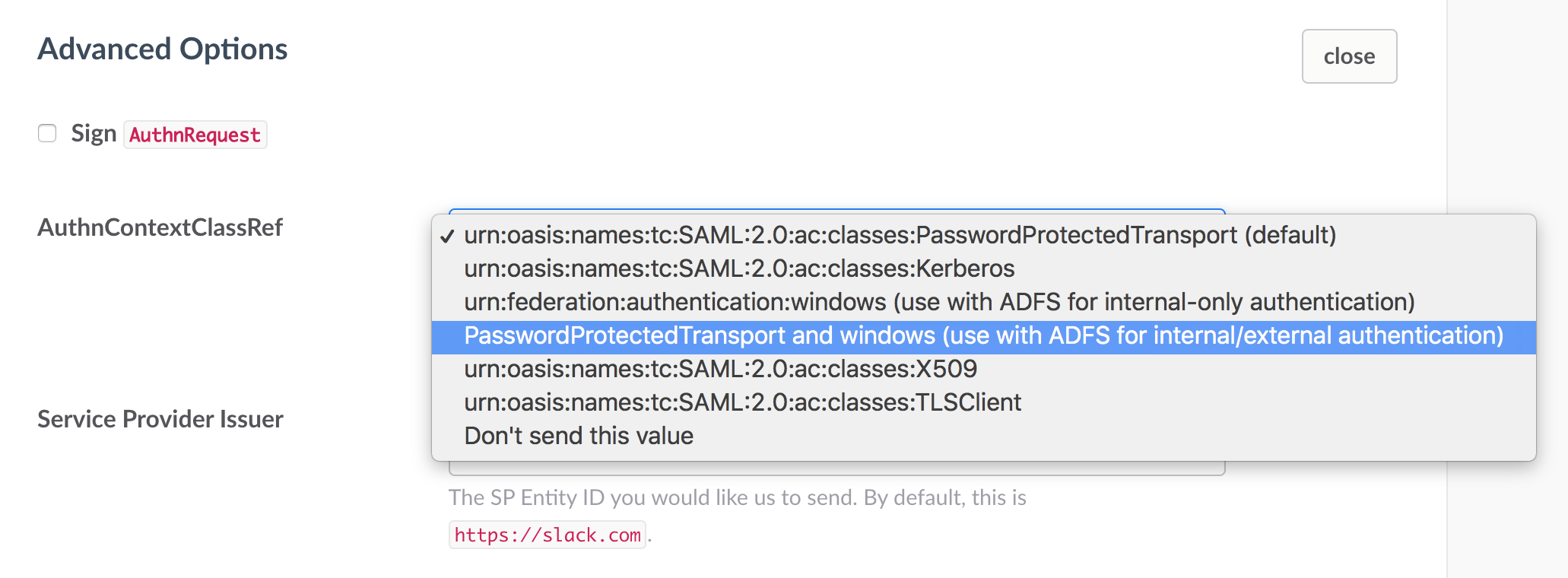 - Con Slack, puoi impostare più di una attendibilità del componente. Sotto AuthnContextClass Ref, seleziona PasswordProtectedTransport e Windows (utilizza con ADFS per l’autenticazione interna/esterna).