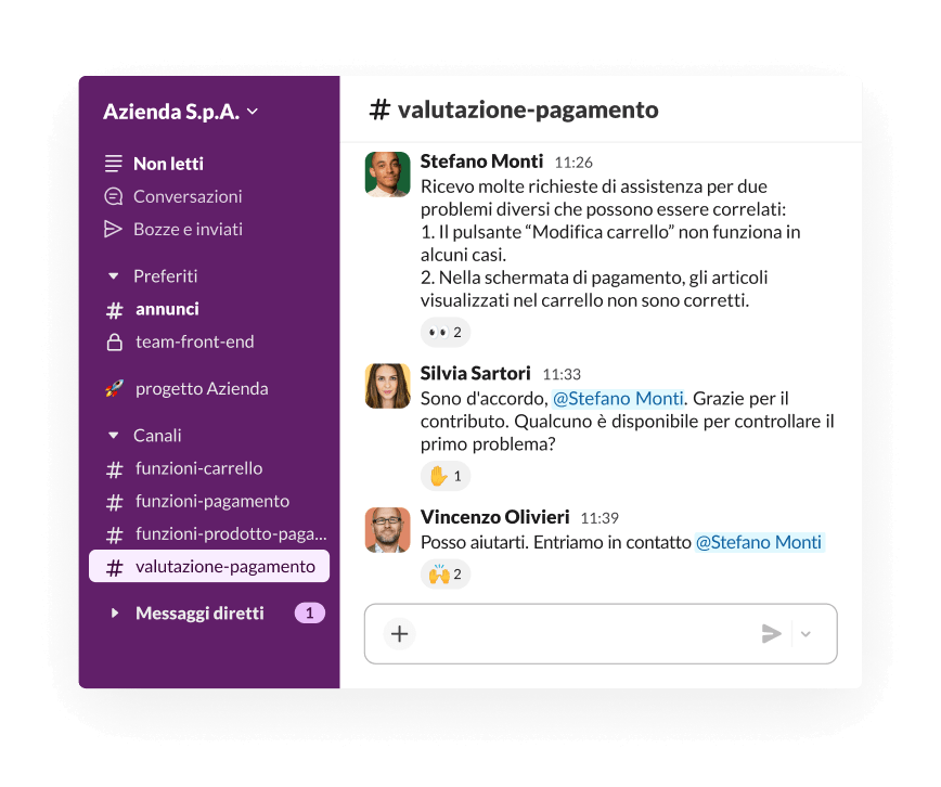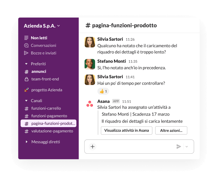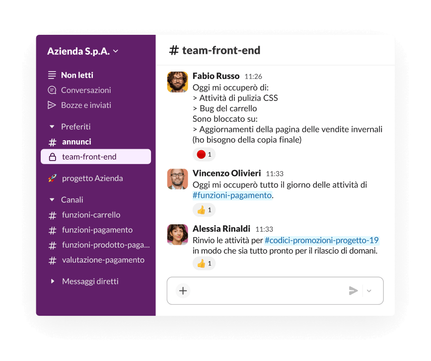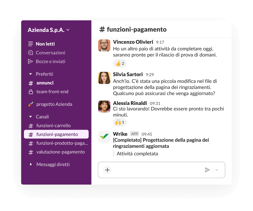 La collaborazione in Slack si svolge in tempo reale: puoi trovare supporto o delegare attività nel flusso della conversazione. Quando tali conversazioni si svolgono nei canali, puoi dare priorità al lavoro e alle attività che richiedono la tua attenzione.