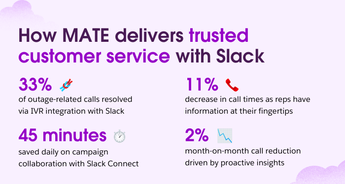 Customer calls are a critical part of MATE’s operations, and fast resolution times are key to maintaining trust and keeping customers satisfied. With Slack, MATE has streamlined how teams access and share information, so customer representatives can resolve issues more efficiently.