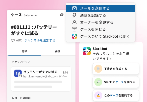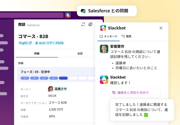 Slackbot があなたのチャンネル、会話、顧客を把握し、プロンプトに基づいてアクションをすぐさま実行。新規取引先の作成、最新の通話メモの記録、レコードの更新はすべて Slack 上で完結します。あなたがやることは Slackbot への依頼だけ。