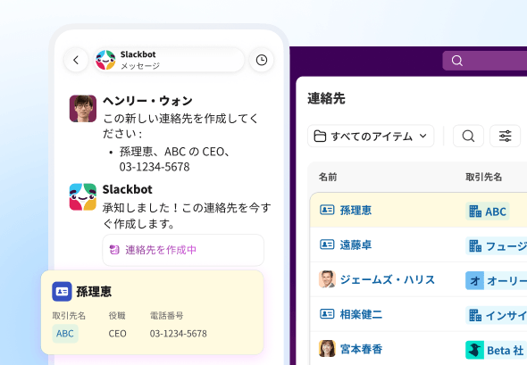 Slack CRM は、軽量な顧客管理(CRM)機能を、Slack にネイティブに組み込みます。連絡先の作成や更新、リードと案件の追跡、アクティビティの記録を、仕事を進める会話から実行できます。また Slackbot を使えば、最新情報の記録、次のステップの把握、レコードの最新化も簡単です。