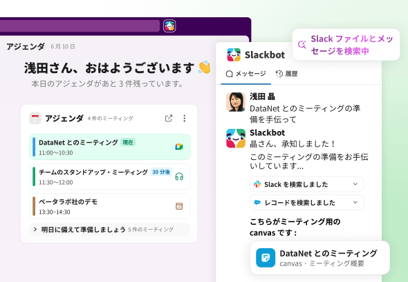 取引先のリサーチ、打ち合わせの準備、フォローアップメッセージの下書きが数秒で完了。簡単な依頼をするだけで、Slackbot が雑務をこなしてデータを最新の状態に保つため、顧客との関係構築に充てられる時間が増加します。
